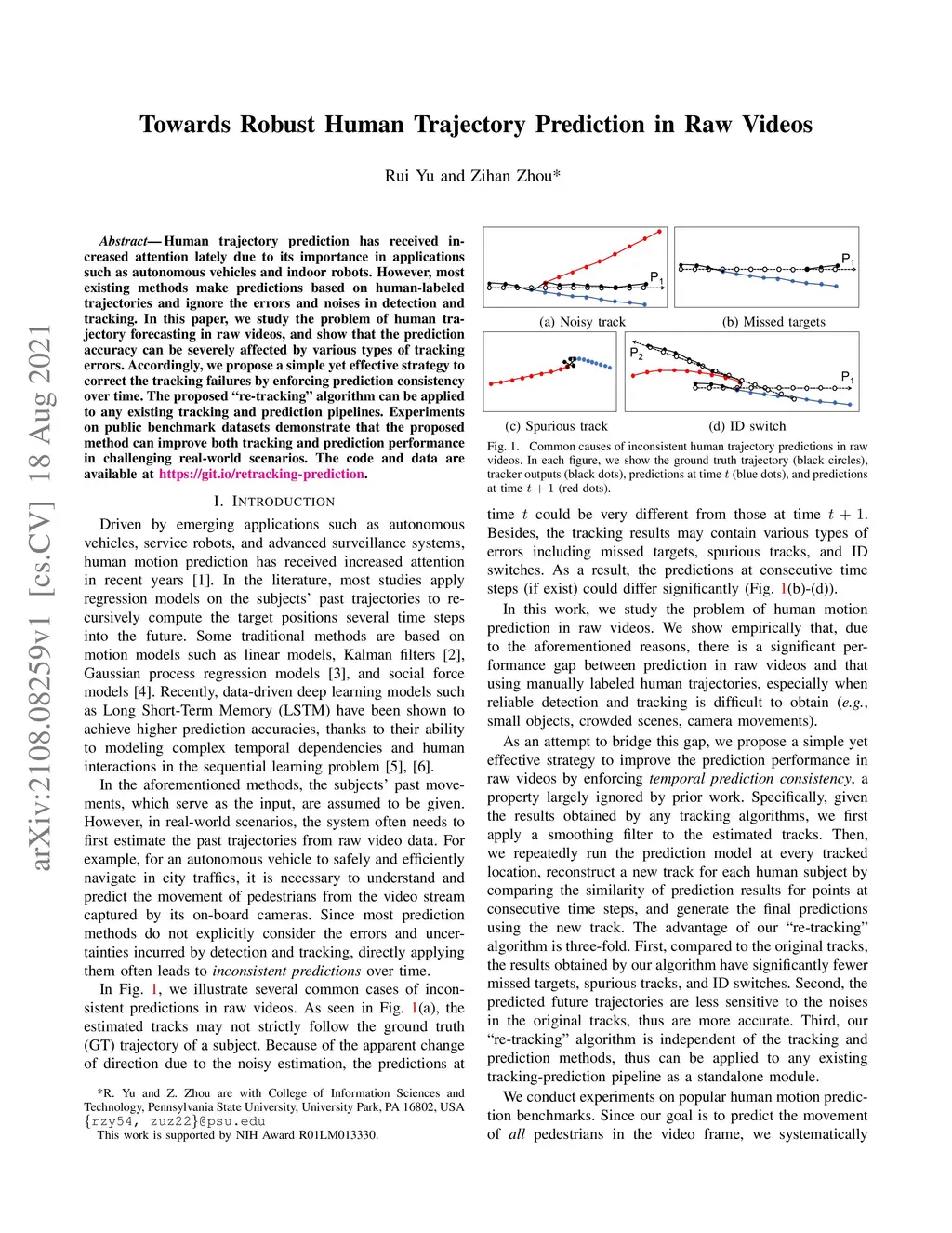 Human trajectory prediction has received increased attention lately due to its importance in applications such as autonomous vehicles and indoor robots. However, most existing methods make predictions based on human-labeled trajectories and ignore the errors and noises in detection and tracking. In this paper, we study the problem of human trajectory forecasting in raw videos, and show that the prediction accuracy can be severely affected by various types of tracking errors. Accordingly, we propose a simple yet effective strategy to correct the tracking failures by enforcing prediction consistency over time. The proposed "re-tracking" algorithm can be applied to any existing tracking and prediction pipelines. Experiments on public benchmark datasets demonstrate that the proposed method can improve both tracking and prediction performance in challenging real-world scenarios. The code and data are available at https://git.io/retracking-prediction.
