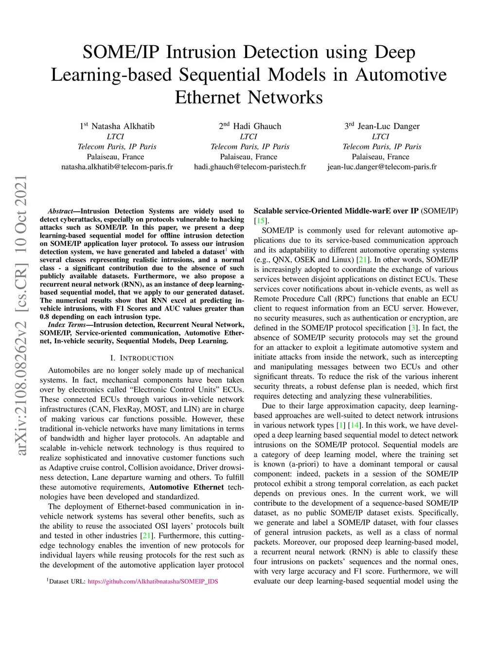 Intrusion Detection Systems are widely used to detect cyberattacks, especially on protocols vulnerable to hacking attacks such as SOME/IP. In this paper, we present a deep learning-based sequential model for offline intrusion detection on SOME/IP application layer protocol. To assess our intrusion detection system, we have generated and labeled a dataset with several classes representing realistic intrusions, and a normal class - a significant contribution due to the absence of such publicly available datasets. Furthermore, we also propose a recurrent neural network (RNN), as an instance of deep learning-based sequential model, that we apply to our generated dataset. The numerical results show that RNN excel at predicting in-vehicle intrusions, with F1 Scores and AUC values greater than 0.8 depending on each intrusion type.