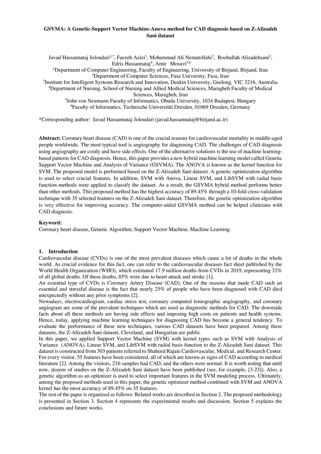 Coronary heart disease (CAD) is one of the crucial reasons for cardiovascular mortality in middle-aged people worldwide. The most typical tool is angiography for diagnosing CAD. The challenges of CAD diagnosis using angiography are costly and have side effects. One of the alternative solutions is the use of machine learning-based patterns for CAD diagnosis. Hence, this paper provides a new hybrid machine learning model called Genetic Support Vector Machine and Analysis of Variance (GSVMA). The ANOVA is known as the kernel function for SVM. The proposed model is performed based on the Z-Alizadeh Sani dataset. A genetic optimization algorithm is used to select crucial features. In addition, SVM with Anova, Linear SVM, and LibSVM with radial basis function methods were applied to classify the dataset. As a result, the GSVMA hybrid method performs better than other methods. This proposed method has the highest accuracy of 89.45% through a 10-fold cross-validation technique with 35 selected features on the Z-Alizadeh Sani dataset. Therefore, the genetic optimization algorithm is very effective for improving accuracy. The computer-aided GSVMA method can be helped clinicians with CAD diagnosis.