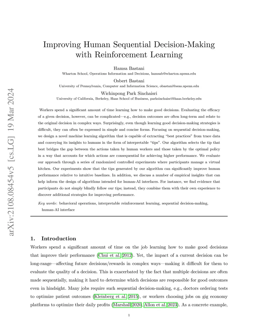 Workers spend a significant amount of time learning how to make good decisions. Evaluating the efficacy of a given decision, however, can be complicated -- e.g., decision outcomes are often long-term and relate to the original decision in complex ways. Surprisingly, even though learning good decision-making strategies is difficult, they can often be expressed in simple and concise forms. Focusing on sequential decision-making, we design a novel machine learning algorithm that is capable of extracting "best practices" from trace data and conveying its insights to humans in the form of interpretable "tips". Our algorithm selects the tip that best bridges the gap between the actions taken by human workers and those taken by the optimal policy in a way that accounts for which actions are consequential for achieving higher performance. We evaluate our approach through a series of randomized controlled experiments where participants manage a virtual kitchen. Our experiments show that the tips generated by our algorithm can significantly improve human performance relative to intuitive baselines. In addition, we discuss a number of empirical insights that can help inform the design of algorithms intended for human-AI interfaces. For instance, we find evidence that participants do not simply blindly follow our tips; instead, they combine them with their own experience to discover additional strategies for improving performance.