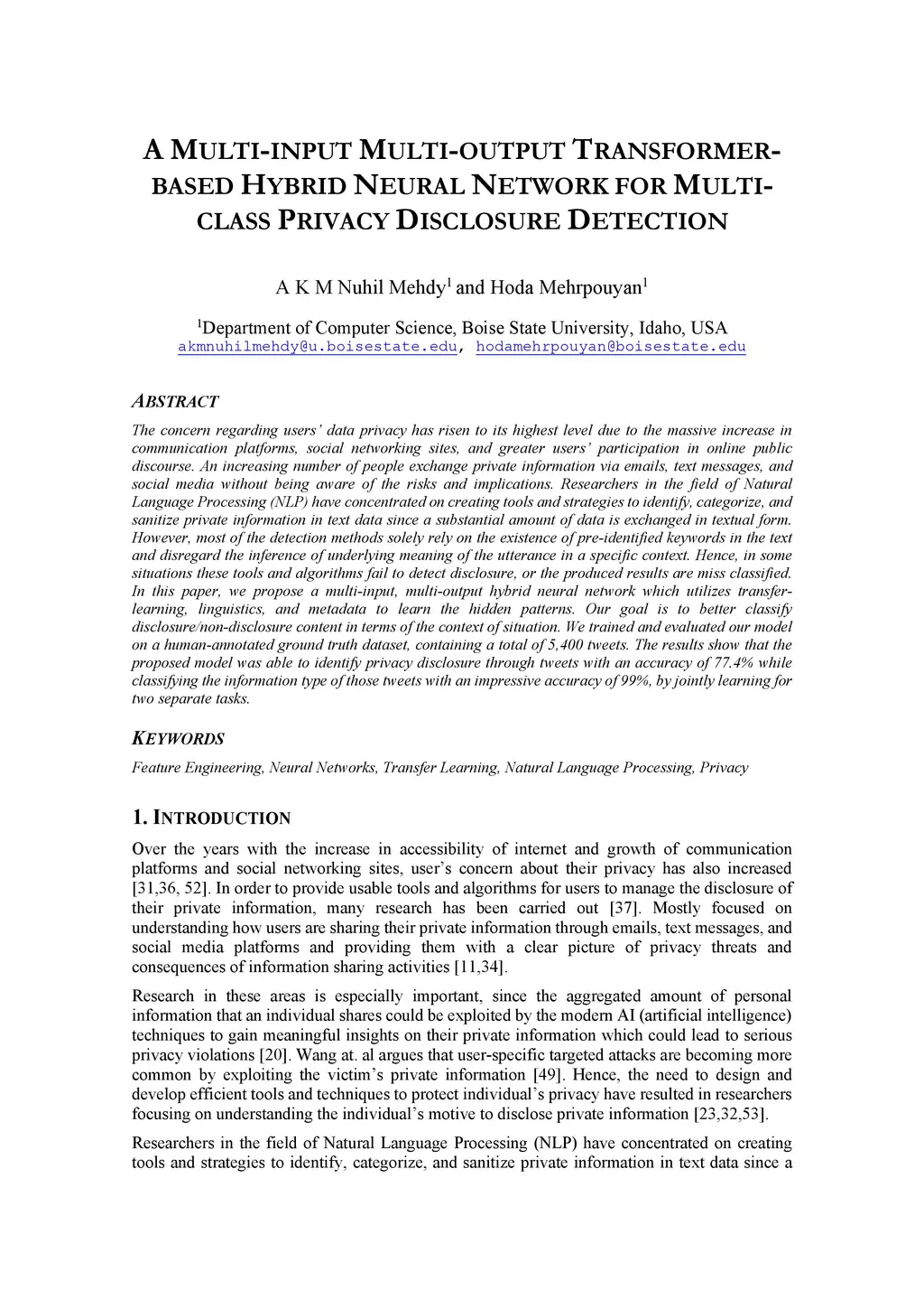 The concern regarding users' data privacy has risen to its highest level due to the massive increase in communication platforms, social networking sites, and greater users' participation in online public discourse. An increasing number of people exchange private information via emails, text messages, and social media without being aware of the risks and implications. Researchers in the field of Natural Language Processing (NLP) have concentrated on creating tools and strategies to identify, categorize, and sanitize private information in text data since a substantial amount of data is exchanged in textual form. However, most of the detection methods solely rely on the existence of pre-identified keywords in the text and disregard the inference of the underlying meaning of the utterance in a specific context. Hence, in some situations, these tools and algorithms fail to detect disclosure, or the produced results are miss-classified. In this paper, we propose a multi-input, multi-output hybrid neural network which utilizes transfer-learning, linguistics, and metadata to learn the hidden patterns. Our goal is to better classify disclosure/non-disclosure content in terms of the context of situation. We trained and evaluated our model on a human-annotated ground truth dataset, containing a total of 5,400 tweets. The results show that the proposed model was able to identify privacy disclosure through tweets with an accuracy of 77.4% while classifying the information type of those tweets with an impressive accuracy of 99%, by jointly learning for two separate tasks.