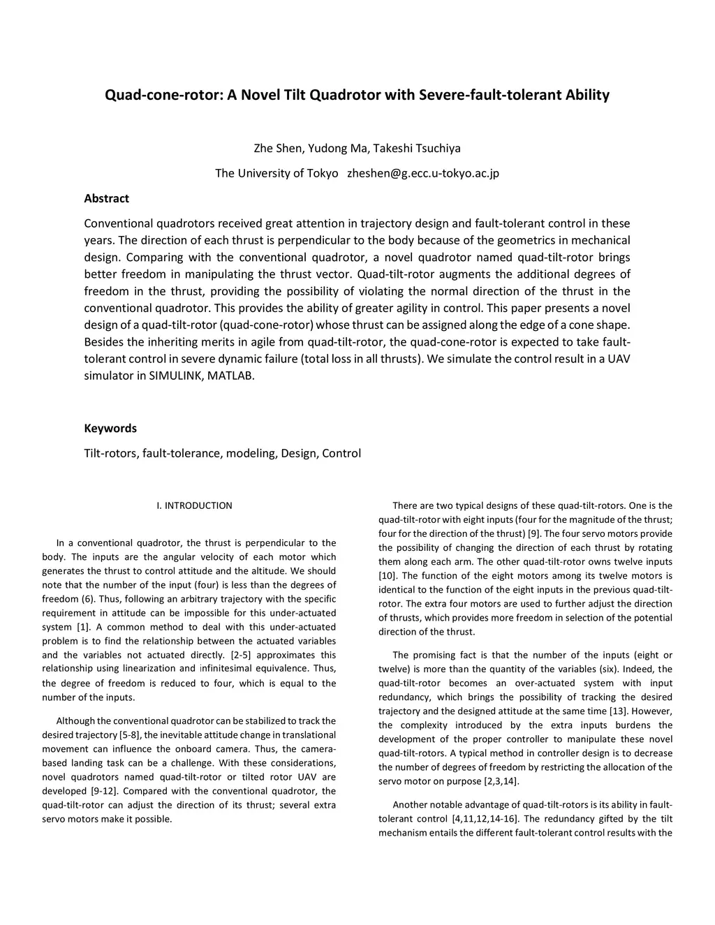 Conventional quadrotors received great attention in trajectory design and fault-tolerant control in these years. The direction of each thrust is perpendicular to the body because of the geometrics in mechanical design. Comparing with the conventional quadrotor, a novel quadrotor named quad-tilt-rotor brings better freedom in manipulating the thrust vector. Quad-tilt-rotor augments the additional degrees of freedom in the thrust, providing the possibility of violating the normal direction of the thrust in the conventional quadrotor. This provides the ability of greater agility in control. This paper presents a novel design of a quad-tilt-rotor (quad-cone-rotor) whose thrust can be assigned along the edge of a cone shape. Besides the inheriting merits in agile from quad-tilt-rotor, the quad-cone-rotor is expected to take fault-tolerant control in severe dynamic failure (total loss in all thrusts). We simulate the control result in a UAV simulator in SIMULINK, MATLAB.