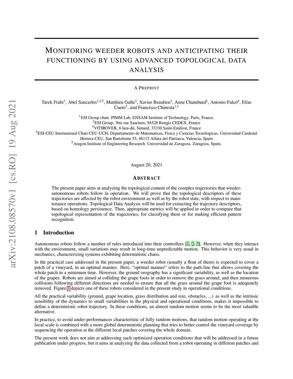The present paper aims at analyzing the topological content of the complex trajectories that weeder-autonomous robots follow in operation. We will prove that the topological descriptors of these trajectories are affected by the robot environment as well as by the robot state, with respect to maintenance operations. Topological Data Analysis will be used for extracting the trajectory descriptors, based on homology persistence. Then, appropriate metrics will be applied in order to compare that topological representation of the trajectories, for classifying them or for making efficient pattern recognition.