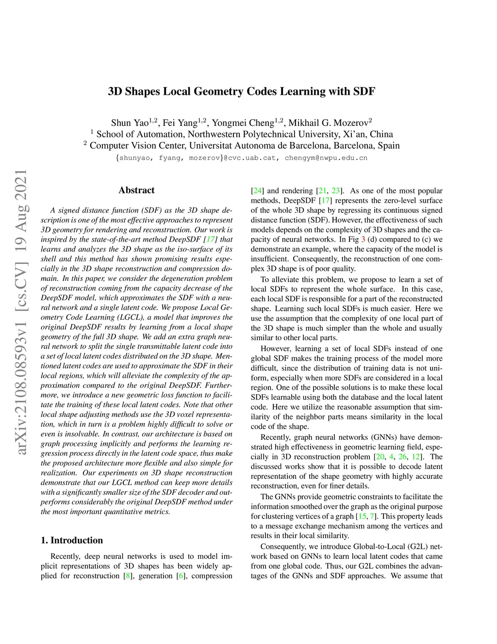 A signed distance function (SDF) as the 3D shape description is one of the most effective approaches to represent 3D geometry for rendering and reconstruction. Our work is inspired by the state-of-the-art method DeepSDF that learns and analyzes the 3D shape as the iso-surface of its shell and this method has shown promising results especially in the 3D shape reconstruction and compression domain. In this paper, we consider the degeneration problem of reconstruction coming from the capacity decrease of the DeepSDF model, which approximates the SDF with a neural network and a single latent code. We propose Local Geometry Code Learning (LGCL), a model that improves the original DeepSDF results by learning from a local shape geometry of the full 3D shape. We add an extra graph neural network to split the single transmittable latent code into a set of local latent codes distributed on the 3D shape. Mentioned latent codes are used to approximate the SDF in their local regions, which will alleviate the complexity of the approximation compared to the original DeepSDF. Furthermore, we introduce a new geometric loss function to facilitate the training of these local latent codes. Note that other local shape adjusting methods use the 3D voxel representation, which in turn is a problem highly difficult to solve or even is insolvable. In contrast, our architecture is based on graph processing implicitly and performs the learning regression process directly in the latent code space, thus make the proposed architecture more flexible and also simple for realization. Our experiments on 3D shape reconstruction demonstrate that our LGCL method can keep more details with a significantly smaller size of the SDF decoder and outperforms considerably the original DeepSDF method under the most important quantitative metrics.