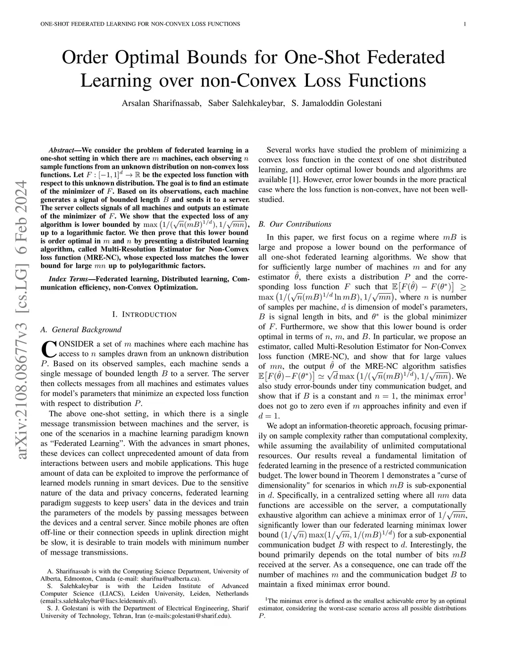 We consider the problem of federated learning in a one-shot setting in which there are machines, each observing sample functions from an unknown distribution on non-convex loss functions. Let be the expected loss function with respect to this unknown distribution. The goal is to find an estimate of the minimizer of . Based on its observations, each machine generates a signal of bounded length and sends it to a server. The server collects signals of all machines and outputs an estimate of the minimizer of . We show that the expected loss of any algorithm is lower bounded by , up to a logarithmic factor. We then prove that this lower bound is order optimal in and by presenting a distributed learning algorithm, called Multi-Resolution Estimator for Non-Convex loss function (MRE-NC), whose expected loss matches the lower bound for large up to polylogarithmic factors.