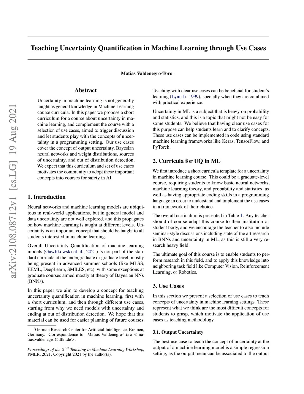 Uncertainty in machine learning is not generally taught as general knowledge in Machine Learning course curricula. In this paper we propose a short curriculum for a course about uncertainty in machine learning, and complement the course with a selection of use cases, aimed to trigger discussion and let students play with the concepts of uncertainty in a programming setting. Our use cases cover the concept of output uncertainty, Bayesian neural networks and weight distributions, sources of uncertainty, and out of distribution detection. We expect that this curriculum and set of use cases motivates the community to adopt these important concepts into courses for safety in AI.