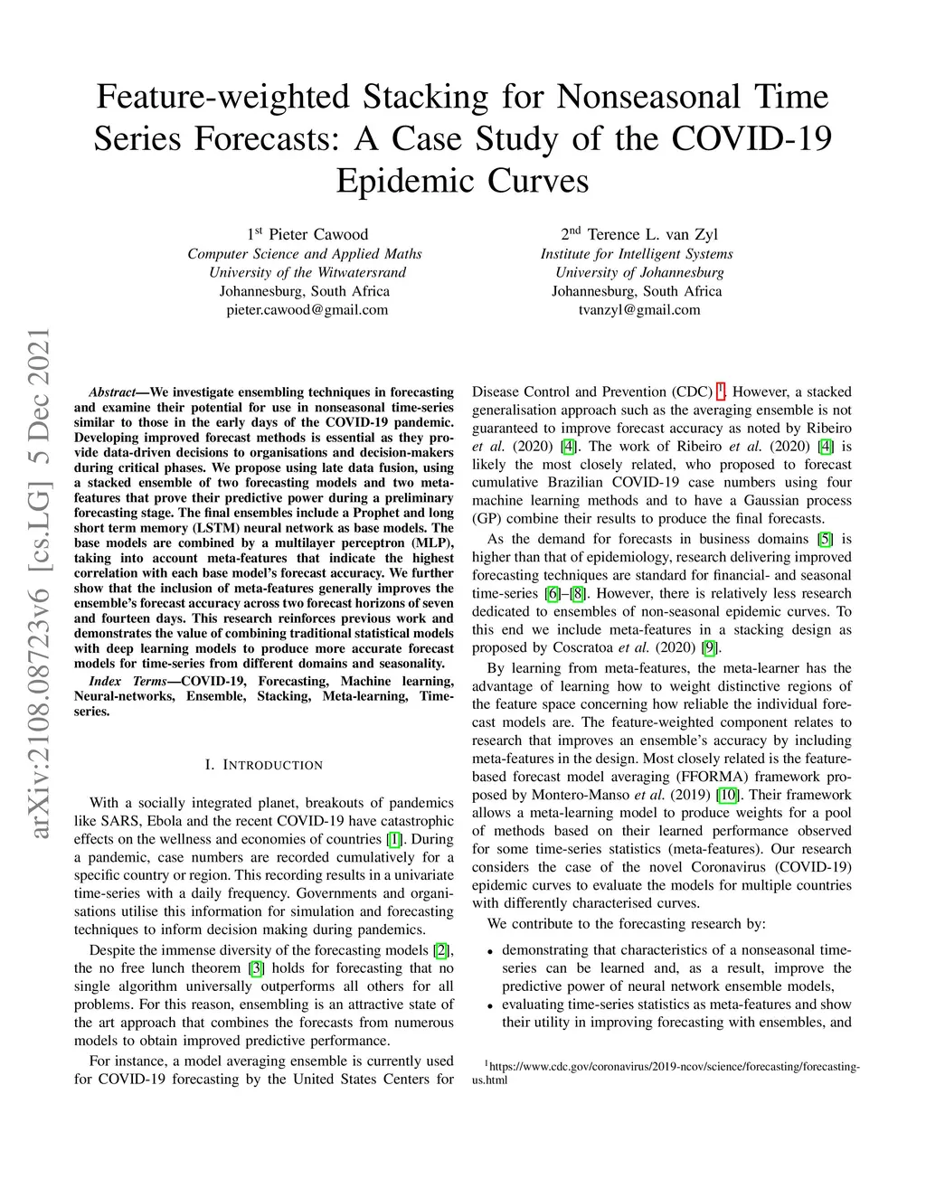 We investigate ensembling techniques in forecasting and examine their potential for use in nonseasonal time-series similar to those in the early days of the COVID-19 pandemic. Developing improved forecast methods is essential as they provide data-driven decisions to organisations and decision-makers during critical phases. We propose using late data fusion, using a stacked ensemble of two forecasting models and two meta-features that prove their predictive power during a preliminary forecasting stage. The final ensembles include a Prophet and long short term memory (LSTM) neural network as base models. The base models are combined by a multilayer perceptron (MLP), taking into account meta-features that indicate the highest correlation with each base model's forecast accuracy. We further show that the inclusion of meta-features generally improves the ensemble's forecast accuracy across two forecast horizons of seven and fourteen days. This research reinforces previous work and demonstrates the value of combining traditional statistical models with deep learning models to produce more accurate forecast models for time-series from different domains and seasonality.