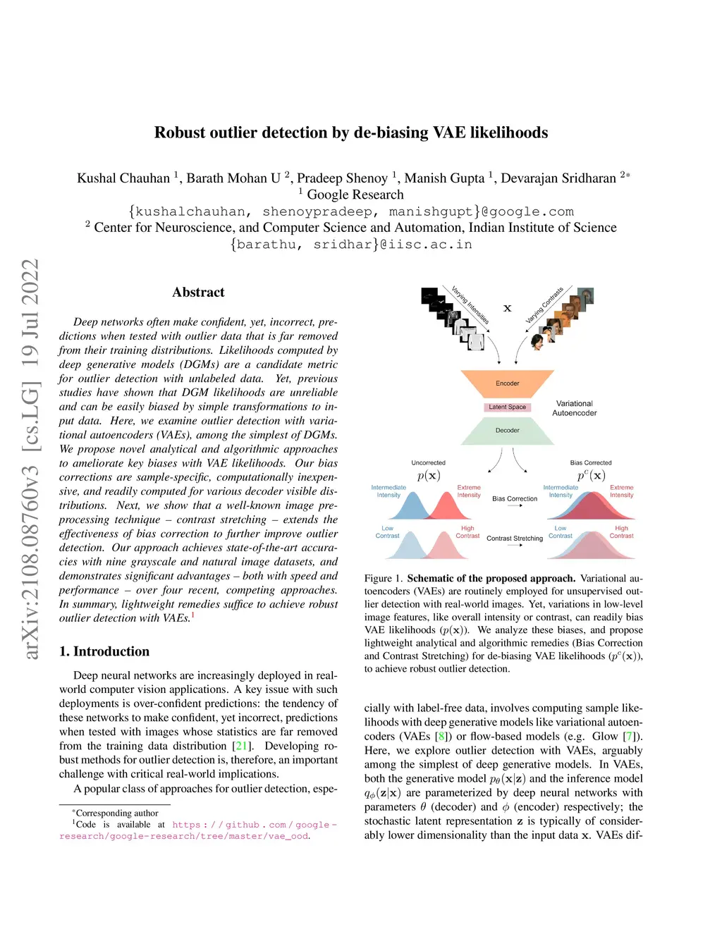 Deep networks often make confident, yet, incorrect, predictions when tested with outlier data that is far removed from their training distributions. Likelihoods computed by deep generative models (DGMs) are a candidate metric for outlier detection with unlabeled data. Yet, previous studies have shown that DGM likelihoods are unreliable and can be easily biased by simple transformations to input data. Here, we examine outlier detection with variational autoencoders (VAEs), among the simplest of DGMs. We propose novel analytical and algorithmic approaches to ameliorate key biases with VAE likelihoods. Our bias corrections are sample-specific, computationally inexpensive, and readily computed for various decoder visible distributions. Next, we show that a well-known image pre-processing technique -- contrast stretching -- extends the effectiveness of bias correction to further improve outlier detection. Our approach achieves state-of-the-art accuracies with nine grayscale and natural image datasets, and demonstrates significant advantages -- both with speed and performance -- over four recent, competing approaches. In summary, lightweight remedies suffice to achieve robust outlier detection with VAEs.