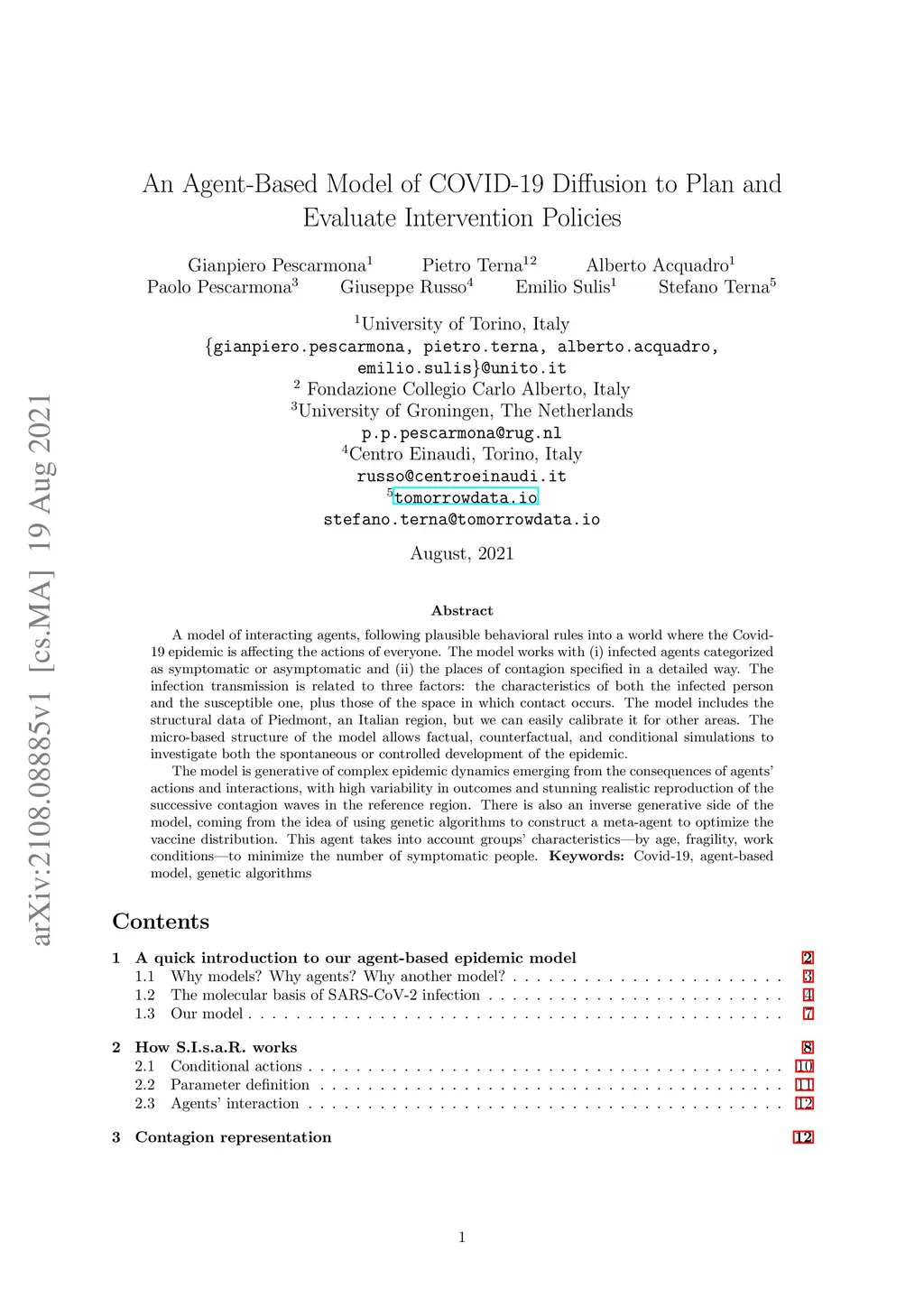 A model of interacting agents, following plausible behavioral rules into a world where the Covid-19 epidemic is affecting the actions of everyone. The model works with (i) infected agents categorized as symptomatic or asymptomatic and (ii) the places of contagion specified in a detailed way. The infection transmission is related to three factors: the characteristics of both the infected person and the susceptible one, plus those of the space in which contact occurs. The model includes the structural data of Piedmont, an Italian region, but we can easily calibrate it for other areas. The micro-based structure of the model allows factual, counterfactual, and conditional simulations to investigate both the spontaneous or controlled development of the epidemic. The model is generative of complex epidemic dynamics emerging from the consequences of agents' actions and interactions, with high variability in outcomes and stunning realistic reproduction of the successive contagion waves in the reference region. There is also an inverse generative side of the model, coming from the idea of using genetic algorithms to construct a meta-agent to optimize the vaccine distribution. This agent takes into account groups' characteristics -- by age, fragility, work conditions -- to minimize the number of symptomatic people.