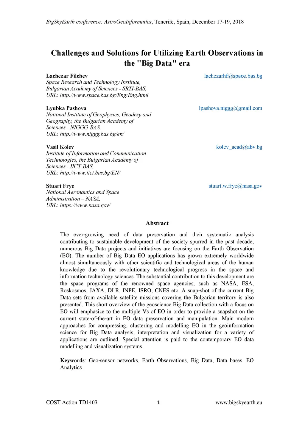The ever-growing need of data preservation and their systematic analysis contributing to sustainable development of the society spurred in the past decade,numerous Big Data projects and initiatives are focusing on the Earth Observation (EO). The number of Big Data EO applications has grown extremely worldwide almost simultaneously with other scientific and technological areas of the human knowledge due to the revolutionary technological progress in the space and information technology sciences. The substantial contribution to this development are the space programs of the renowned space agencies, such as NASA, ESA,Roskosmos, JAXA, DLR, INPE, ISRO, CNES etc. A snap-shot of the current Big Data sets from available satellite missions covering the Bulgarian territory is also presented. This short overview of the geoscience Big Data collection with a focus on EO will emphasize to the multiple Vs of EO in order to provide a snapshot on the current state-of-the-art in EO data preservation and manipulation. Main modern approaches for compressing, clustering and modelling EO in the geoinformation science for Big Data analysis, interpretation and visualization for a variety of applications are outlined. Special attention is paid to the contemporary EO data modelling and visualization systems.