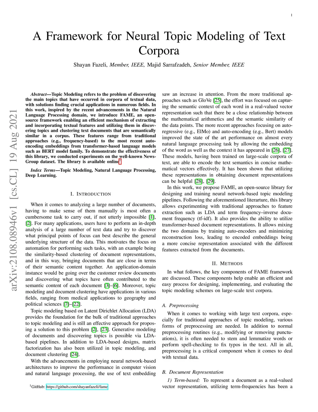 Topic Modeling refers to the problem of discovering the main topics that have occurred in corpora of textual data, with solutions finding crucial applications in numerous fields. In this work, inspired by the recent advancements in the Natural Language Processing domain, we introduce FAME, an open-source framework enabling an efficient mechanism of extracting and incorporating textual features and utilizing them in discovering topics and clustering text documents that are semantically similar in a corpus. These features range from traditional approaches (e.g., frequency-based) to the most recent auto-encoding embeddings from transformer-based language models such as BERT model family. To demonstrate the effectiveness of this library, we conducted experiments on the well-known News-Group dataset. The library is available online.