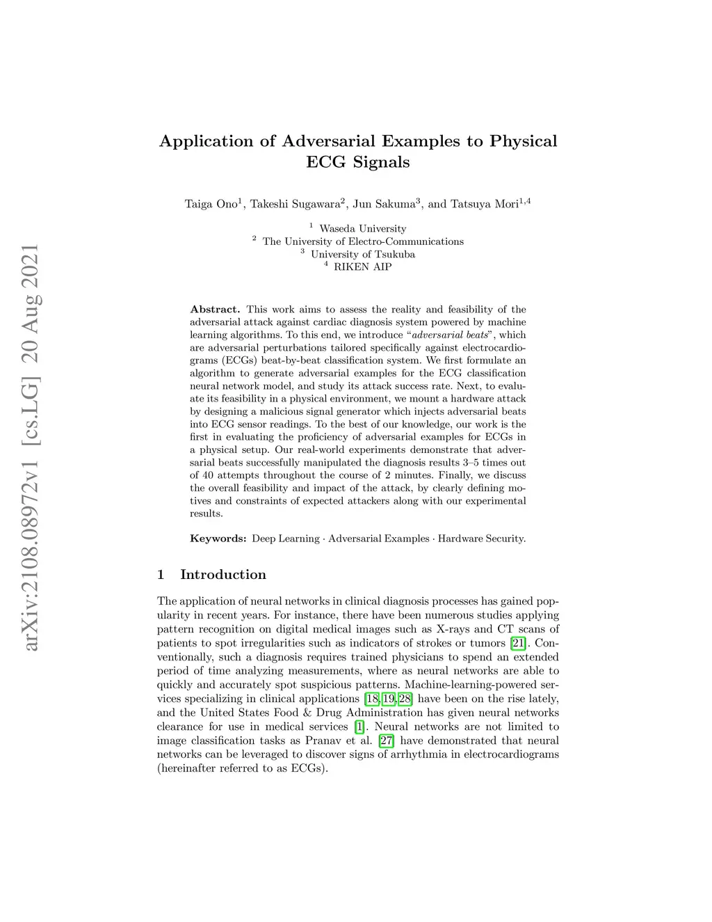 Application of Adversarial Examples to Physical ECG Signals
