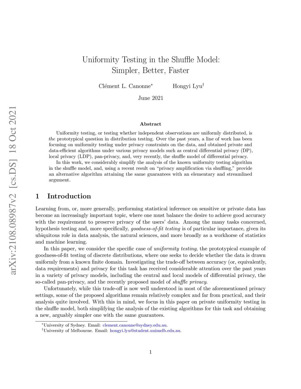 Uniformity testing, or testing whether independent observations are uniformly distributed, is the prototypical question in distribution testing. Over the past years, a line of work has been focusing on uniformity testing under privacy constraints on the data, and obtained private and data-efficient algorithms under various privacy models such as central differential privacy (DP), local privacy (LDP), pan-privacy, and, very recently, the shuffle model of differential privacy. In this work, we considerably simplify the analysis of the known uniformity testing algorithm in the shuffle model, and, using a recent result on "privacy amplification via shuffling," provide an alternative algorithm attaining the same guarantees with an elementary and streamlined argument.