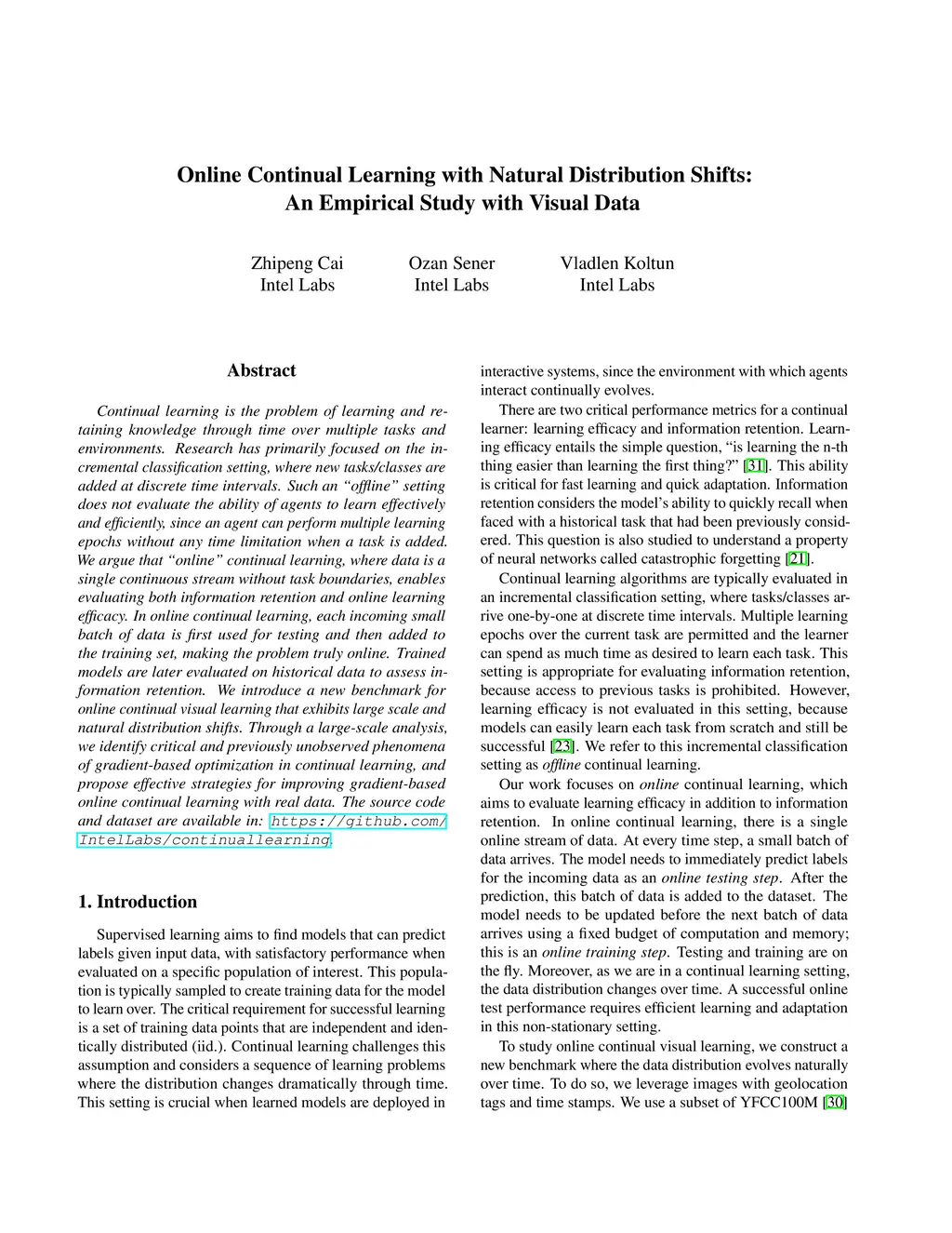 Continual learning is the problem of learning and retaining knowledge through time over multiple tasks and environments. Research has primarily focused on the incremental classification setting, where new tasks/classes are added at discrete time intervals. Such an "offline" setting does not evaluate the ability of agents to learn effectively and efficiently, since an agent can perform multiple learning epochs without any time limitation when a task is added. We argue that "online" continual learning, where data is a single continuous stream without task boundaries, enables evaluating both information retention and online learning efficacy. In online continual learning, each incoming small batch of data is first used for testing and then added to the training set, making the problem truly online. Trained models are later evaluated on historical data to assess information retention. We introduce a new benchmark for online continual visual learning that exhibits large scale and natural distribution shifts. Through a large-scale analysis, we identify critical and previously unobserved phenomena of gradient-based optimization in continual learning, and propose effective strategies for improving gradient-based online continual learning with real data. The source code and dataset are available in: https://github.com/IntelLabs/continuallearning.
