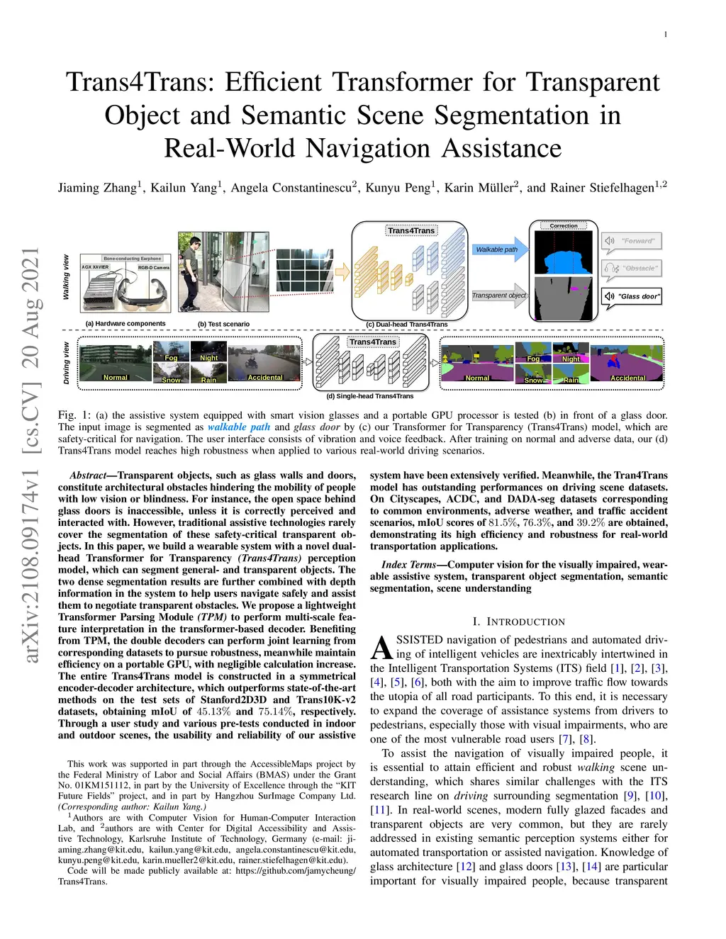 Transparent objects, such as glass walls and doors, constitute architectural obstacles hindering the mobility of people with low vision or blindness. For instance, the open space behind glass doors is inaccessible, unless it is correctly perceived and interacted with. However, traditional assistive technologies rarely cover the segmentation of these safety-critical transparent objects. In this paper, we build a wearable system with a novel dual-head Transformer for Transparency (Trans4Trans) perception model, which can segment general- and transparent objects. The two dense segmentation results are further combined with depth information in the system to help users navigate safely and assist them to negotiate transparent obstacles. We propose a lightweight Transformer Parsing Module (TPM) to perform multi-scale feature interpretation in the transformer-based decoder. Benefiting from TPM, the double decoders can perform joint learning from corresponding datasets to pursue robustness, meanwhile maintain efficiency on a portable GPU, with negligible calculation increase. The entire Trans4Trans model is constructed in a symmetrical encoder-decoder architecture, which outperforms state-of-the-art methods on the test sets of Stanford2D3D and Trans10K-v2 datasets, obtaining mIoU of 45.13% and 75.14%, respectively. Through a user study and various pre-tests conducted in indoor and outdoor scenes, the usability and reliability of our assistive system have been extensively verified. Meanwhile, the Tran4Trans model has outstanding performances on driving scene datasets. On Cityscapes, ACDC, and DADA-seg datasets corresponding to common environments, adverse weather, and traffic accident scenarios, mIoU scores of 81.5%, 76.3%, and 39.2% are obtained, demonstrating its high efficiency and robustness for real-world transportation applications.