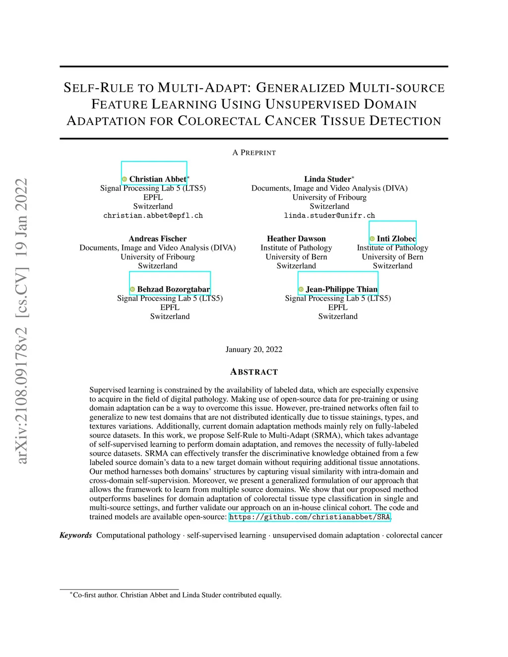 Supervised learning is constrained by the availability of labeled data, which are especially expensive to acquire in the field of digital pathology. Making use of open-source data for pre-training or using domain adaptation can be a way to overcome this issue. However, pre-trained networks often fail to generalize to new test domains that are not distributed identically due to tissue stainings, types, and textures variations. Additionally, current domain adaptation methods mainly rely on fully-labeled source datasets. In this work, we propose Self-Rule to Multi-Adapt (SRMA), which takes advantage of self-supervised learning to perform domain adaptation, and removes the necessity of fully-labeled source datasets. SRMA can effectively transfer the discriminative knowledge obtained from a few labeled source domain's data to a new target domain without requiring additional tissue annotations. Our method harnesses both domains' structures by capturing visual similarity with intra-domain and cross-domain self-supervision. Moreover, we present a generalized formulation of our approach that allows the framework to learn from multiple source domains. We show that our proposed method outperforms baselines for domain adaptation of colorectal tissue type classification \new{in single and multi-source settings}, and further validate our approach on an in-house clinical cohort. The code and trained models are available open-source: https://github.com/christianabbet/SRA.