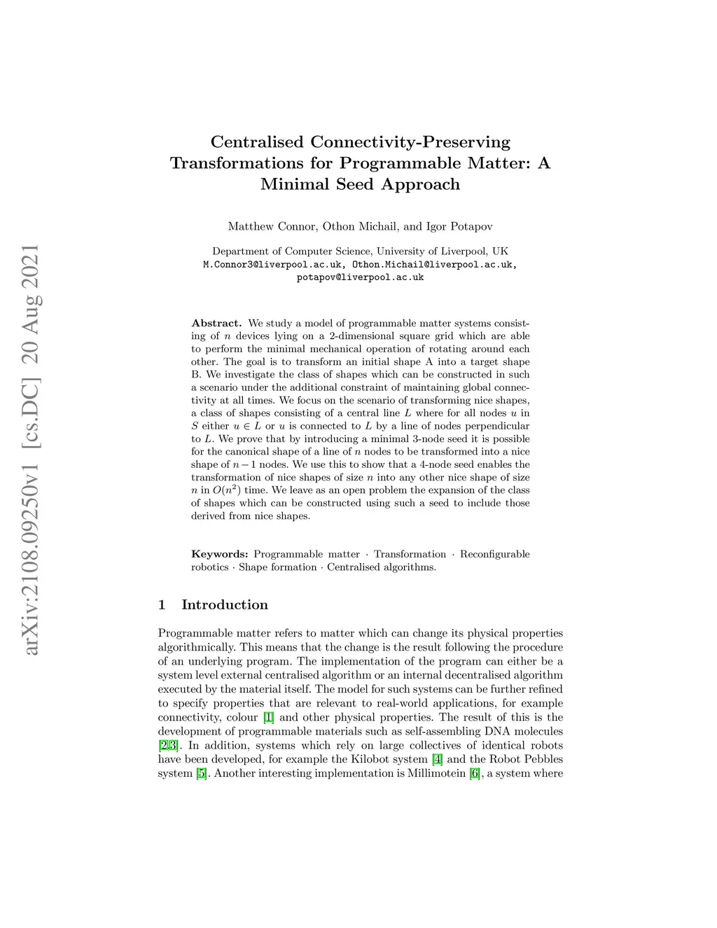 We study a model of programmable matter systems consisting of devices lying on a 2-dimensional square grid which are able to perform the minimal mechanical operation of rotating around each other. The goal is to transform an initial shape A into a target shape B. We investigate the class of shapes which can be constructed in such a scenario under the additional constraint of maintaining global connectivity at all times. We focus on the scenario of transforming nice shapes, a class of shapes consisting of a central line where for all nodes in either or is connected to by a line of nodes perpendicular to . We prove that by introducing a minimal 3-node seed it is possible for the canonical shape of a line of nodes to be transformed into a nice shape of nodes. We use this to show that a 4-node seed enables the transformation of nice shapes of size into any other nice shape of size in time. We leave as an open problem the expansion of the class of shapes which can be constructed using such a seed to include those derived from nice shapes.