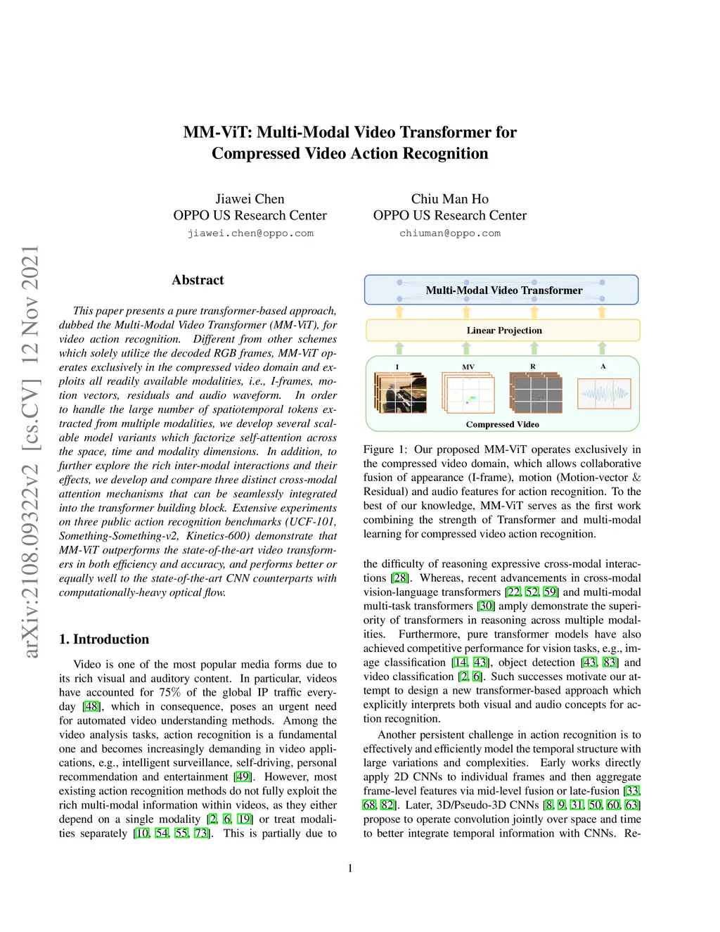 MM-ViT: Multi-Modal Video Transformer for Compressed Video Action