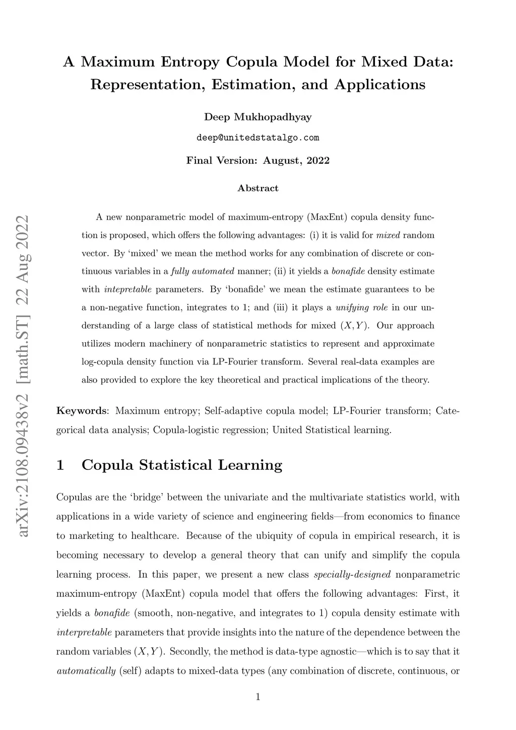 A new nonparametric model of maximum-entropy (MaxEnt) copula density function is proposed, which offers the following advantages: (i) it is valid for mixed random vector. By `mixed' we mean the method works for any combination of discrete or continuous variables in a fully automated manner; (ii) it yields a bonafide density estimate with intepretable parameters. By `bonafide' we mean the estimate guarantees to be a non-negative function, integrates to 1; and (iii) it plays a unifying role in our understanding of a large class of statistical methods. Our approach utilizes modern machinery of nonparametric statistics to represent and approximate log-copula density function via LP-Fourier transform. Several real-data examples are also provided to explore the key theoretical and practical implications of the theory.