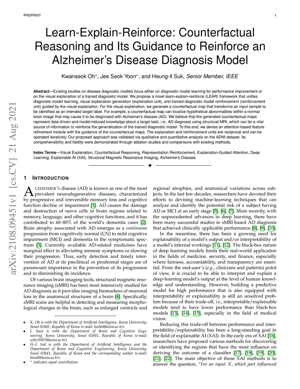 Existing studies on disease diagnostic models focus either on diagnostic model learning for performance improvement or on the visual explanation of a trained diagnostic model. We propose a novel learn-explain-reinforce (LEAR) framework that unifies diagnostic model learning, visual explanation generation (explanation unit), and trained diagnostic model reinforcement (reinforcement unit) guided by the visual explanation. For the visual explanation, we generate a counterfactual map that transforms an input sample to be identified as an intended target label. For example, a counterfactual map can localize hypothetical abnormalities within a normal brain image that may cause it to be diagnosed with Alzheimer's disease (AD). We believe that the generated counterfactual maps represent data-driven and model-induced knowledge about a target task, i.e., AD diagnosis using structural MRI, which can be a vital source of information to reinforce the generalization of the trained diagnostic model. To this end, we devise an attention-based feature refinement module with the guidance of the counterfactual maps. The explanation and reinforcement units are reciprocal and can be operated iteratively. Our proposed approach was validated via qualitative and quantitative analysis on the ADNI dataset. Its comprehensibility and fidelity were demonstrated through ablation studies and comparisons with existing methods.