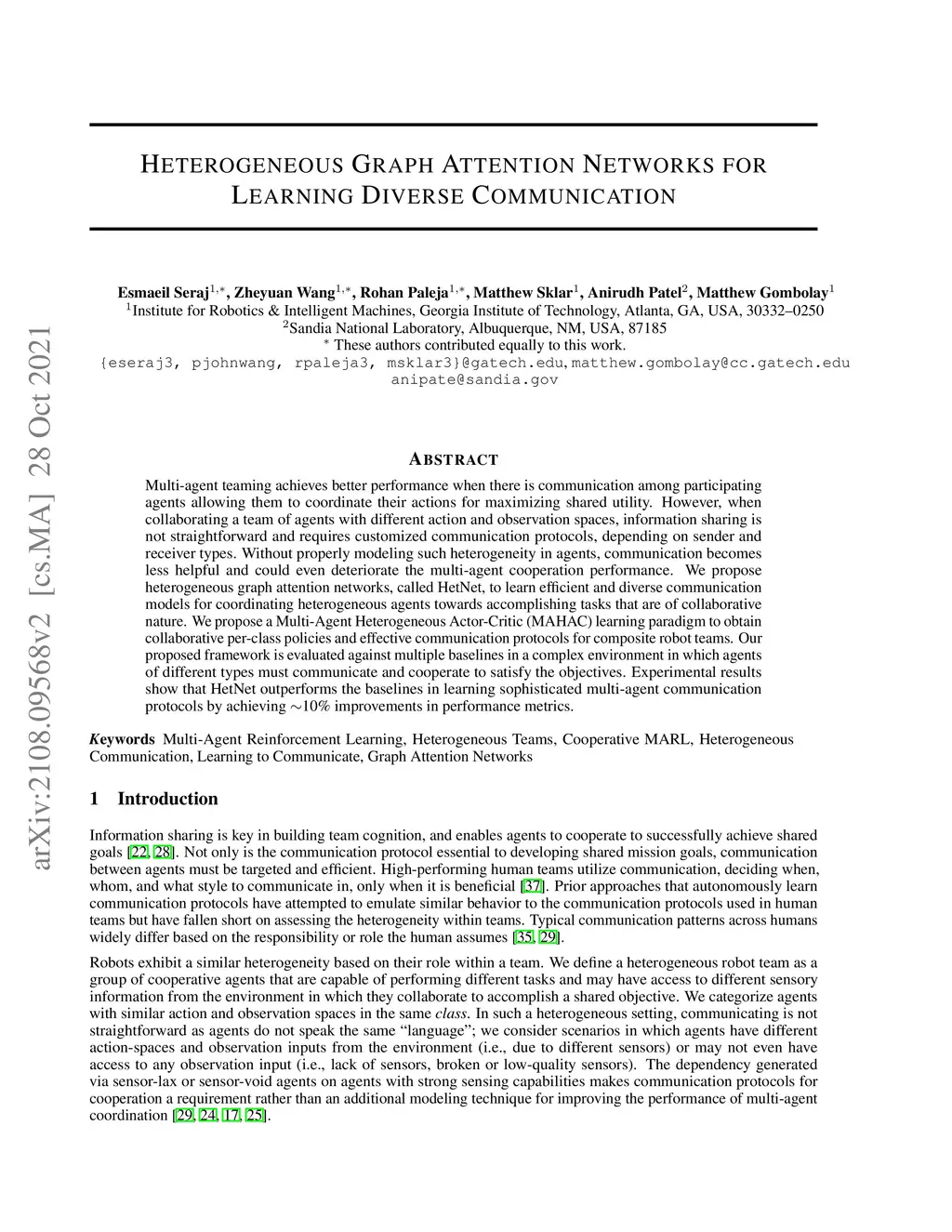 Multi-agent teaming achieves better performance when there is communication among participating agents allowing them to coordinate their actions for maximizing shared utility. However, when collaborating a team of agents with different action and observation spaces, information sharing is not straightforward and requires customized communication protocols, depending on sender and receiver types. Without properly modeling such heterogeneity in agents, communication becomes less helpful and could even deteriorate the multi-agent cooperation performance. We propose heterogeneous graph attention networks, called HetNet, to learn efficient and diverse communication models for coordinating heterogeneous agents towards accomplishing tasks that are of collaborative nature. We propose a Multi-Agent Heterogeneous Actor-Critic (MAHAC) learning paradigm to obtain collaborative per-class policies and effective communication protocols for composite robot teams. Our proposed framework is evaluated against multiple baselines in a complex environment in which agents of different types must communicate and cooperate to satisfy the objectives. Experimental results show that HetNet outperforms the baselines in learning sophisticated multi-agent communication protocols by achieving 10\% improvements in performance metrics.