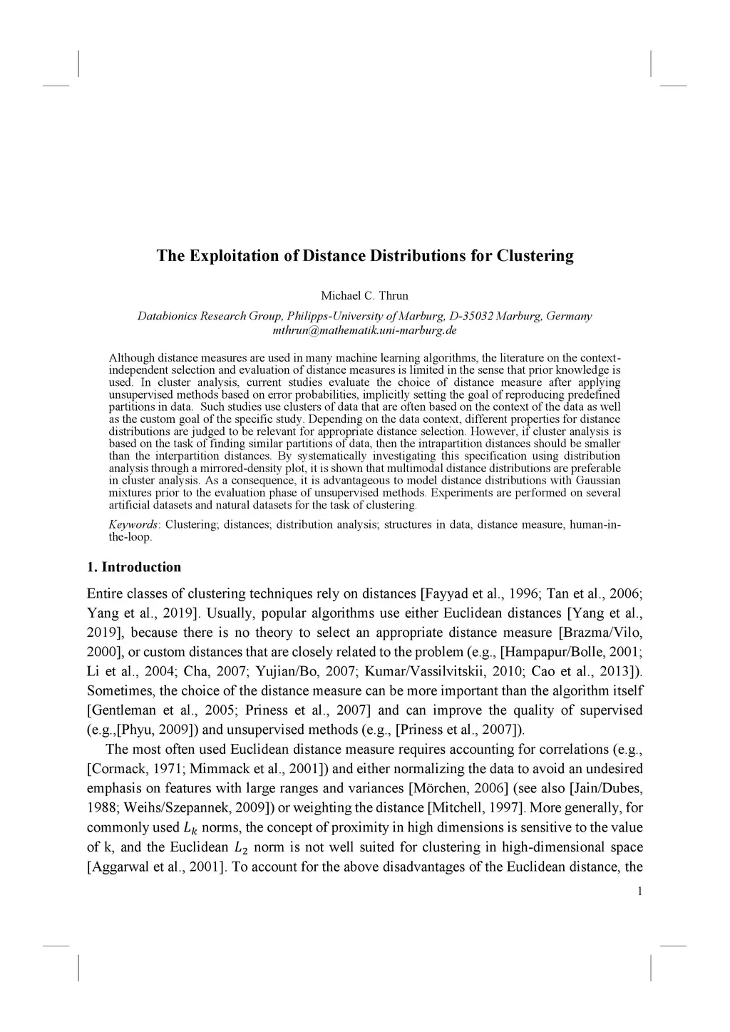 Although distance measures are used in many machine learning algorithms, the literature on the context-independent selection and evaluation of distance measures is limited in the sense that prior knowledge is used. In cluster analysis, current studies evaluate the choice of distance measure after applying unsupervised methods based on error probabilities, implicitly setting the goal of reproducing predefined partitions in data. Such studies use clusters of data that are often based on the context of the data as well as the custom goal of the specific study. Depending on the data context, different properties for distance distributions are judged to be relevant for appropriate distance selection. However, if cluster analysis is based on the task of finding similar partitions of data, then the intrapartition distances should be smaller than the interpartition distances. By systematically investigating this specification using distribution analysis through a mirrored-density plot, it is shown that multimodal distance distributions are preferable in cluster analysis. As a consequence, it is advantageous to model distance distributions with Gaussian mixtures prior to the evaluation phase of unsupervised methods. Experiments are performed on several artificial datasets and natural datasets for the task of clustering.