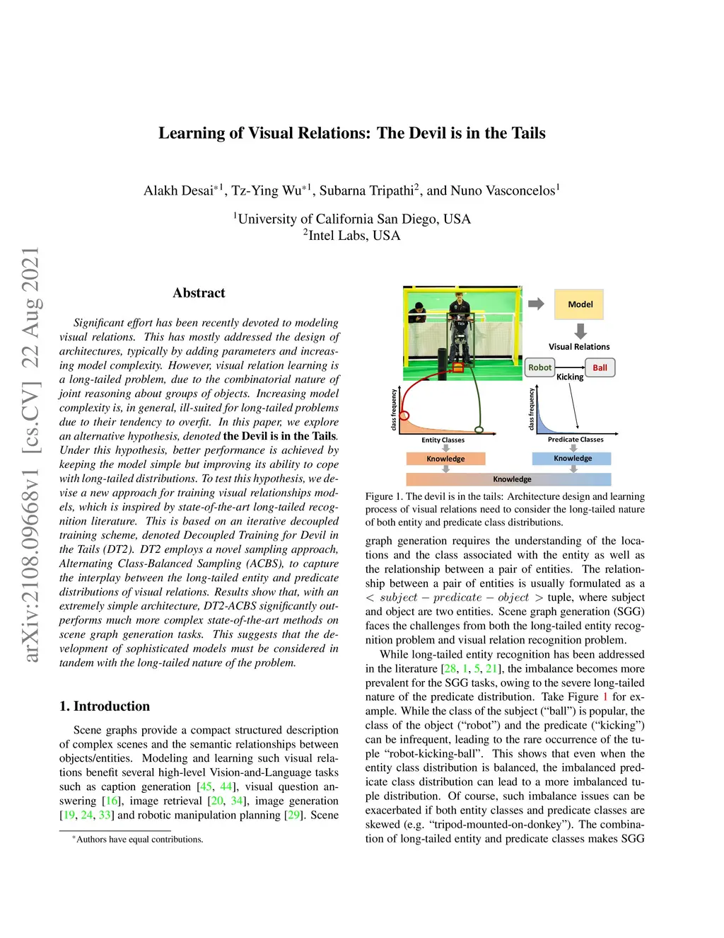Significant effort has been recently devoted to modeling visual relations. This has mostly addressed the design of architectures, typically by adding parameters and increasing model complexity. However, visual relation learning is a long-tailed problem, due to the combinatorial nature of joint reasoning about groups of objects. Increasing model complexity is, in general, ill-suited for long-tailed problems due to their tendency to overfit. In this paper, we explore an alternative hypothesis, denoted the Devil is in the Tails. Under this hypothesis, better performance is achieved by keeping the model simple but improving its ability to cope with long-tailed distributions. To test this hypothesis, we devise a new approach for training visual relationships models, which is inspired by state-of-the-art long-tailed recognition literature. This is based on an iterative decoupled training scheme, denoted Decoupled Training for Devil in the Tails (DT2). DT2 employs a novel sampling approach, Alternating Class-Balanced Sampling (ACBS), to capture the interplay between the long-tailed entity and predicate distributions of visual relations. Results show that, with an extremely simple architecture, DT2-ACBS significantly outperforms much more complex state-of-the-art methods on scene graph generation tasks. This suggests that the development of sophisticated models must be considered in tandem with the long-tailed nature of the problem.