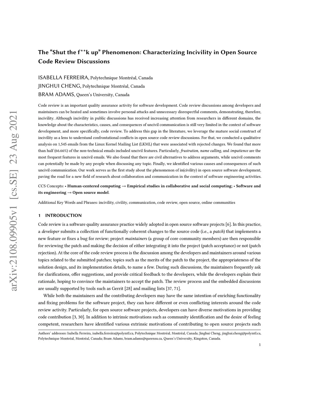 Code review is an important quality assurance activity for software development. Code review discussions among developers and maintainers can be heated and sometimes involve personal attacks and unnecessary disrespectful comments, demonstrating, therefore, incivility. Although incivility in public discussions has received increasing attention from researchers in different domains, the knowledge about the characteristics, causes, and consequences of uncivil communication is still very limited in the context of software development, and more specifically, code review. To address this gap in the literature, we leverage the mature social construct of incivility as a lens to understand confrontational conflicts in open source code review discussions. For that, we conducted a qualitative analysis on 1,545 emails from the Linux Kernel Mailing List (LKML) that were associated with rejected changes. We found that more than half 66.66% of the non-technical emails included uncivil features. Particularly, frustration, name calling, and impatience are the most frequent features in uncivil emails. We also found that there are civil alternatives to address arguments, while uncivil comments can potentially be made by any people when discussing any topic. Finally, we identified various causes and consequences of such uncivil communication. Our work serves as the first study about the phenomenon of in(civility) in open source software development, paving the road for a new field of research about collaboration and communication in the context of software engineering activities.