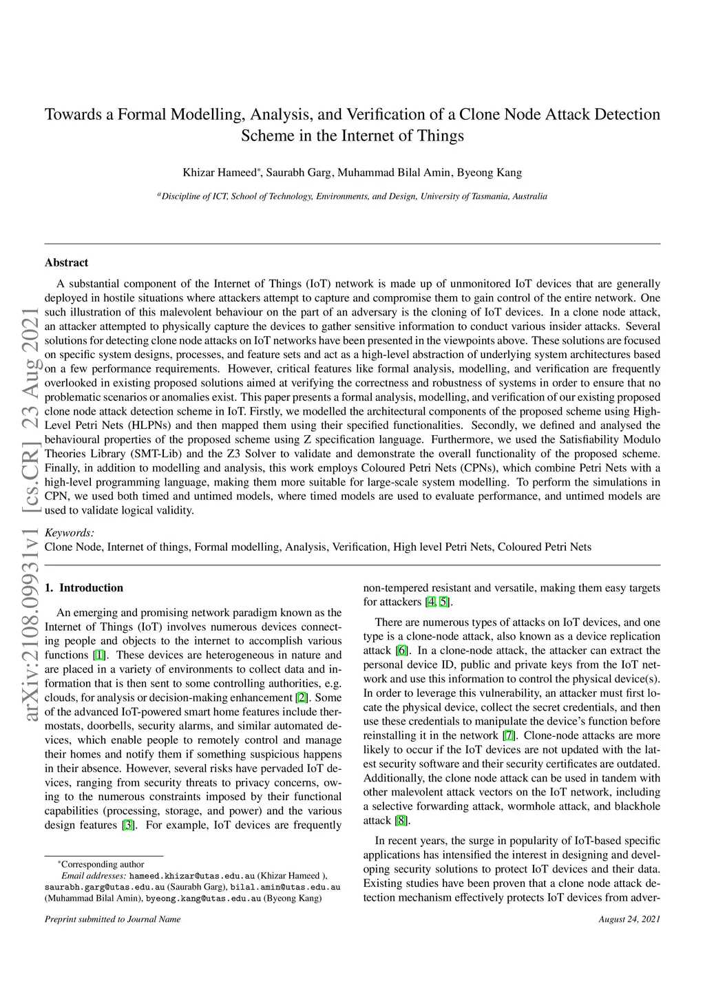 In a clone node attack, an attacker attempted to physically capture the devices to gather sensitive information to conduct various insider attacks. Several solutions for detecting clone node attacks on IoT networks have been presented in the viewpoints above. These solutions are focused on specific system designs, processes, and feature sets and act as a high-level abstraction of underlying system architectures based on a few performance requirements. However, critical features like formal analysis, modelling, and verification are frequently overlooked in existing proposed solutions aimed at verifying the correctness and robustness of systems in order to ensure that no problematic scenarios or anomalies exist. This paper presents a formal analysis, modelling, and verification of our existing proposed clone node attack detection scheme in IoT. Firstly, we modelled the architectural components of the proposed scheme using High-Level Petri Nets (HLPNs) and then mapped them using their specified functionalities. Secondly, we defined and analysed the behavioural properties of the proposed scheme using Z specification language. Furthermore, we used the Satisfiability Modulo Theories Library (SMT-Lib) and the Z3 Solver to validate and demonstrate the overall functionality of the proposed scheme. Finally, in addition to modelling and analysis, this work employs Coloured Petri Nets (CPNs), which combine Petri Nets with a high-level programming language, making them more suitable for large-scale system modelling. To perform the simulations in CPN, we used both timed and untimed models, where timed models are used to evaluate performance, and untimed models are used to validate logical validity.