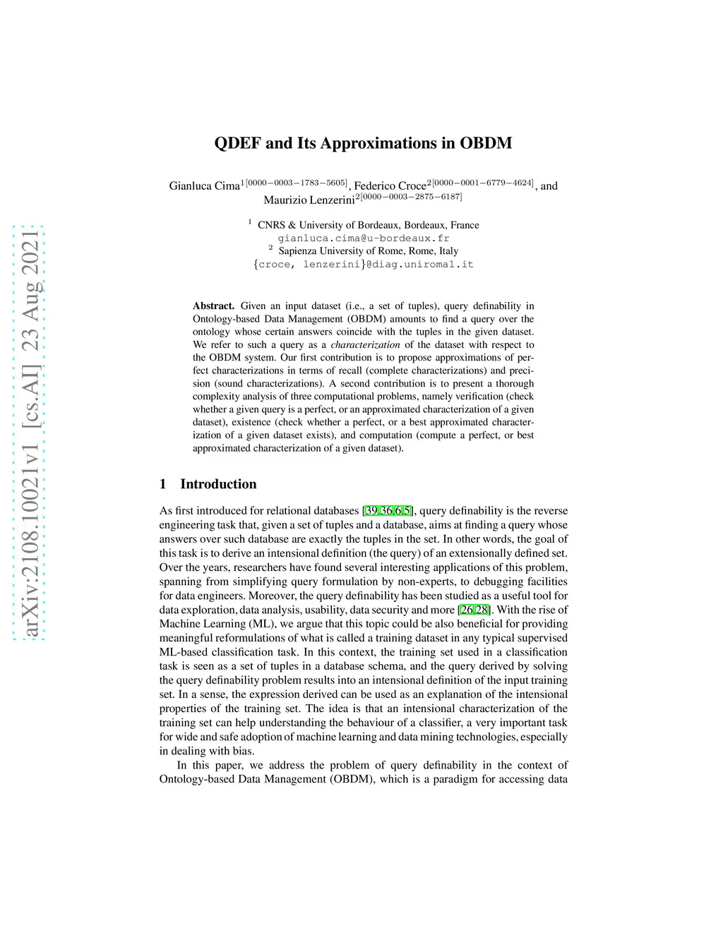 Given an input dataset (i.e., a set of tuples), query definability in Ontology-based Data Management (OBDM) amounts to find a query over the ontology whose certain answers coincide with the tuples in the given dataset. We refer to such a query as a characterization of the dataset with respect to the OBDM system. Our first contribution is to propose approximations of perfect characterizations in terms of recall (complete characterizations) and precision (sound characterizations). A second contribution is to present a thorough complexity analysis of three computational problems, namely verification (check whether a given query is a perfect, or an approximated characterization of a given dataset), existence (check whether a perfect, or a best approximated characterization of a given dataset exists), and computation (compute a perfect, or best approximated characterization of a given dataset).