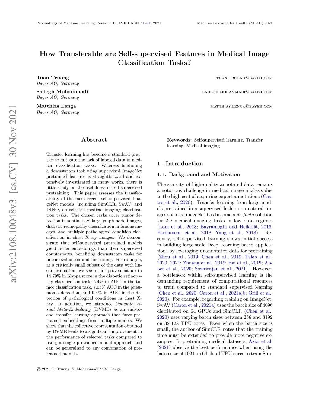 Transfer learning has become a standard practice to mitigate the lack of labeled data in medical classification tasks. Whereas finetuning a downstream task using supervised ImageNet pretrained features is straightforward and extensively investigated in many works, there is little study on the usefulness of self-supervised pretraining. In this paper, we assess the transferability of ImageNet self-supervisedpretraining by evaluating the performance of models initialized with pretrained features from three self-supervised techniques (SimCLR, SwAV, and DINO) on selected medical classification tasks. The chosen tasks cover tumor detection in sentinel axillary lymph node images, diabetic retinopathy classification in fundus images, and multiple pathological condition classification in chest X-ray images. We demonstrate that self-supervised pretrained models yield richer embeddings than their supervised counterpart, which benefits downstream tasks in view of both linear evaluation and finetuning. For example, in view of linear evaluation at acritically small subset of the data, we see an improvement up to 14.79% in Kappa score in the diabetic retinopathy classification task, 5.4% in AUC in the tumor classification task, 7.03% AUC in the pneumonia detection, and 9.4% in AUC in the detection of pathological conditions in chest X-ray. In addition, we introduce Dynamic Visual Meta-Embedding (DVME) as an end-to-end transfer learning approach that fuses pretrained embeddings from multiple models. We show that the collective representation obtained by DVME leads to a significant improvement in the performance of selected tasks compared to using a single pretrained model approach and can be generalized to any combination of pretrained models.