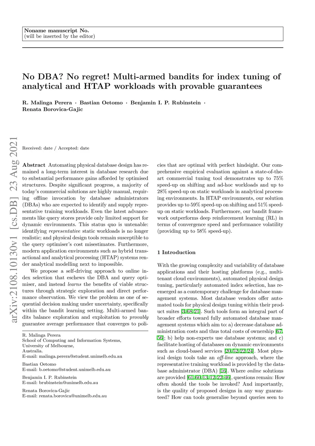 Automating physical database design has remained a long-term interest in database research due to substantial performance gains afforded by optimised structures. Despite significant progress, a majority of today's commercial solutions are highly manual, requiring offline invocation by database administrators (DBAs) who are expected to identify and supply representative training workloads. Even the latest advancements like query stores provide only limited support for dynamic environments. This status quo is untenable: identifying representative static workloads is no longer realistic; and physical design tools remain susceptible to the query optimiser's cost misestimates. Furthermore, modern application environments such as hybrid transactional and analytical processing (HTAP) systems render analytical modelling next to impossible. We propose a self-driving approach to online index selection that eschews the DBA and query optimiser, and instead learns the benefits of viable structures through strategic exploration and direct performance observation. We view the problem as one of sequential decision making under uncertainty, specifically within the bandit learning setting. Multi-armed bandits balance exploration and exploitation to provably guarantee average performance that converges to policies that are optimal with perfect hindsight. Our comprehensive empirical evaluation against a state-of-the-art commercial tuning tool demonstrates up to 75% speed-up on shifting and ad-hoc workloads and up to 28% speed-up on static workloads in analytical processing environments. In HTAP environments, our solution provides up to 59% speed-up on shifting and 51% speed-up on static workloads. Furthermore, our bandit framework outperforms deep reinforcement learning (RL) in terms of convergence speed and performance volatility (providing up to 58% speed-up).