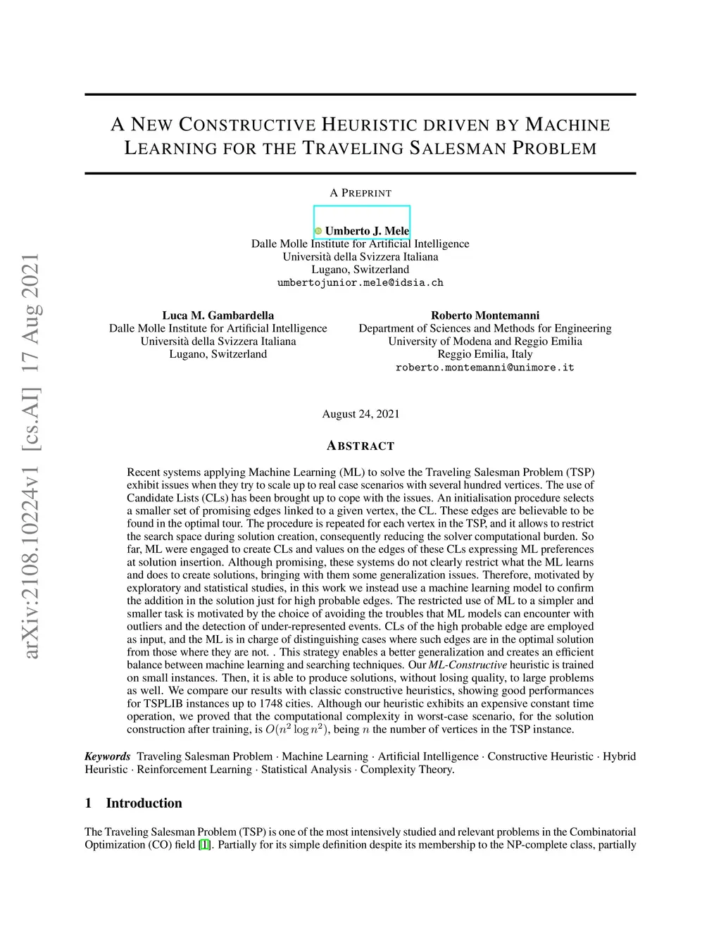 Recent systems applying Machine Learning (ML) to solve the Traveling Salesman Problem (TSP) exhibit issues when they try to scale up to real case scenarios with several hundred vertices. The use of Candidate Lists (CLs) has been brought up to cope with the issues. The procedure allows to restrict the search space during solution creation, consequently reducing the solver computational burden. So far, ML were engaged to create CLs and values on the edges of these CLs expressing ML preferences at solution insertion. Although promising, these systems do not clearly restrict what the ML learns and does to create solutions, bringing with them some generalization issues. Therefore, motivated by exploratory and statistical studies, in this work we instead use a machine learning model to confirm the addition in the solution just for high probable edges. CLs of the high probable edge are employed as input, and the ML is in charge of distinguishing cases where such edges are in the optimal solution from those where they are not. . This strategy enables a better generalization and creates an efficient balance between machine learning and searching techniques. Our ML-Constructive heuristic is trained on small instances. Then, it is able to produce solutions, without losing quality, to large problems as well. We compare our results with classic constructive heuristics, showing good performances for TSPLIB instances up to 1748 cities. Although our heuristic exhibits an expensive constant time operation, we proved that the computational complexity in worst-case scenario, for the solution construction after training, is , being the number of vertices in the TSP instance.
