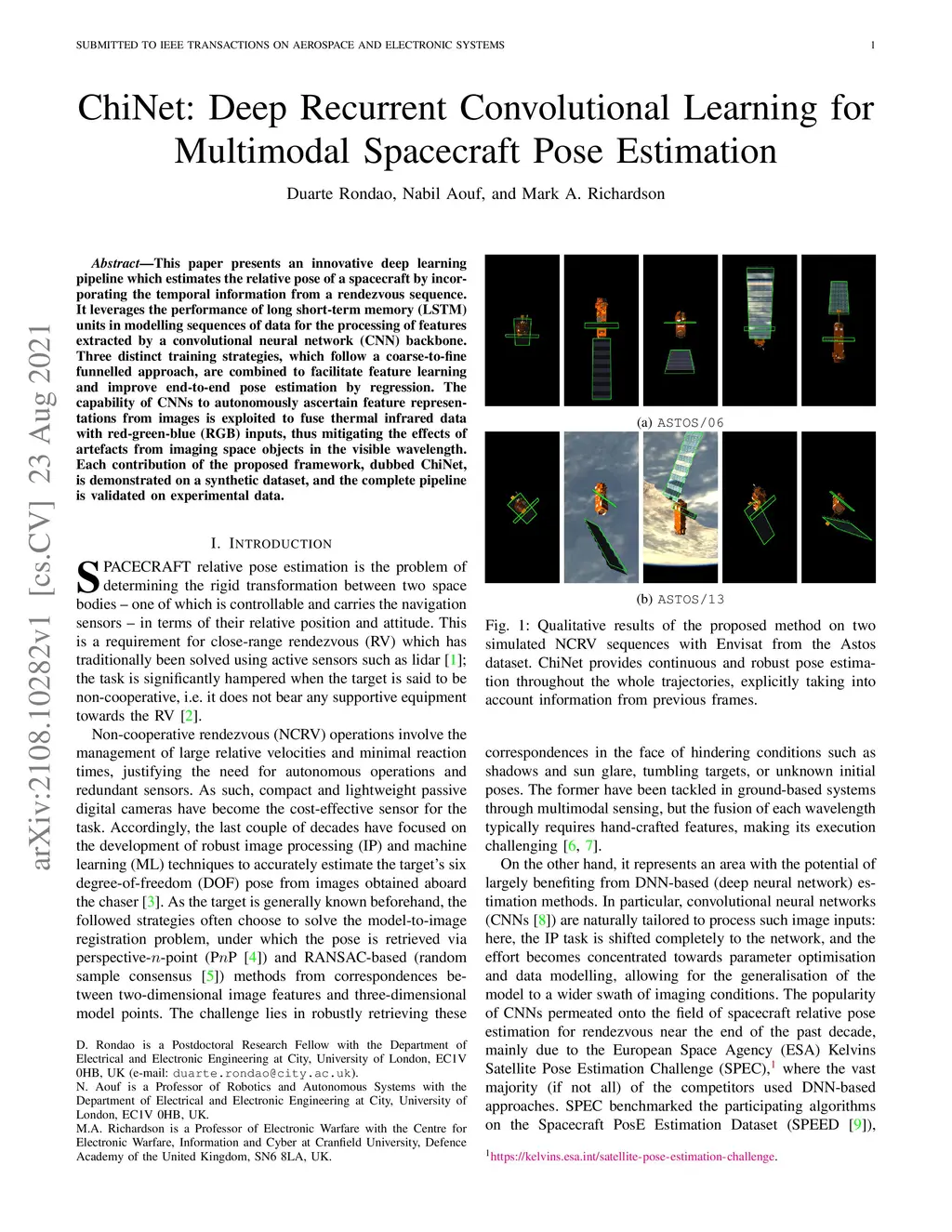 This paper presents an innovative deep learning pipeline which estimates the relative pose of a spacecraft by incorporating the temporal information from a rendezvous sequence. It leverages the performance of long short-term memory (LSTM) units in modelling sequences of data for the processing of features extracted by a convolutional neural network (CNN) backbone. Three distinct training strategies, which follow a coarse-to-fine funnelled approach, are combined to facilitate feature learning and improve end-to-end pose estimation by regression. The capability of CNNs to autonomously ascertain feature representations from images is exploited to fuse thermal infrared data with red-green-blue (RGB) inputs, thus mitigating the effects of artefacts from imaging space objects in the visible wavelength. Each contribution of the proposed framework, dubbed ChiNet, is demonstrated on a synthetic dataset, and the complete pipeline is validated on experimental data.
