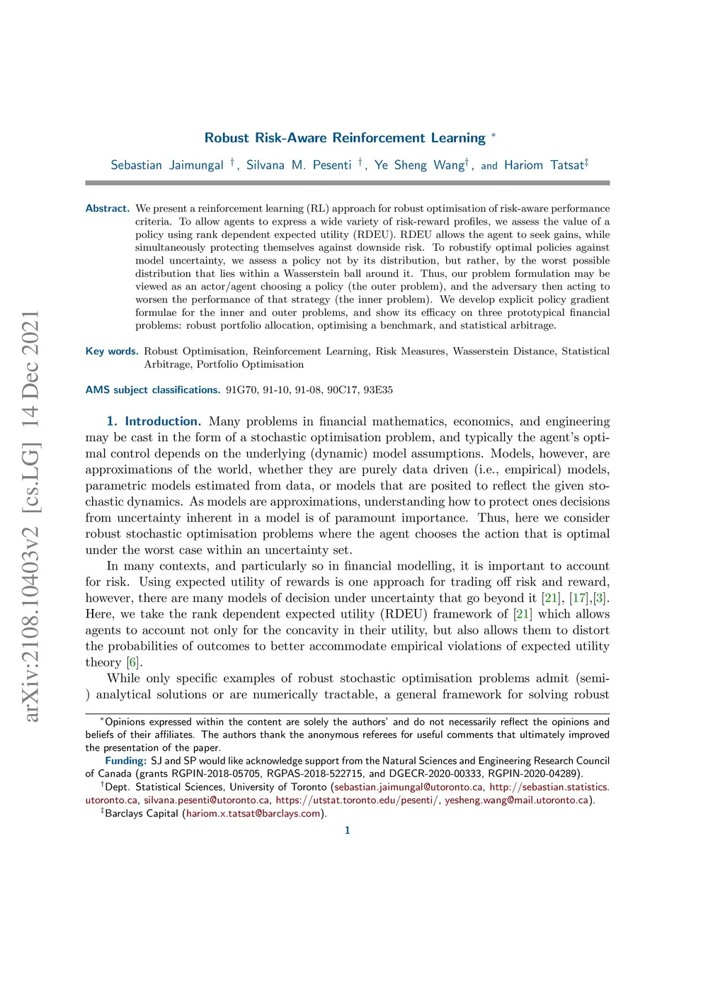We present a reinforcement learning (RL) approach for robust optimisation of risk-aware performance criteria. To allow agents to express a wide variety of risk-reward profiles, we assess the value of a policy using rank dependent expected utility (RDEU). RDEU allows the agent to seek gains, while simultaneously protecting themselves against downside risk. To robustify optimal policies against model uncertainty, we assess a policy not by its distribution, but rather, by the worst possible distribution that lies within a Wasserstein ball around it. Thus, our problem formulation may be viewed as an actor/agent choosing a policy (the outer problem), and the adversary then acting to worsen the performance of that strategy (the inner problem). We develop explicit policy gradient formulae for the inner and outer problems, and show its efficacy on three prototypical financial problems: robust portfolio allocation, optimising a benchmark, and statistical arbitrage.