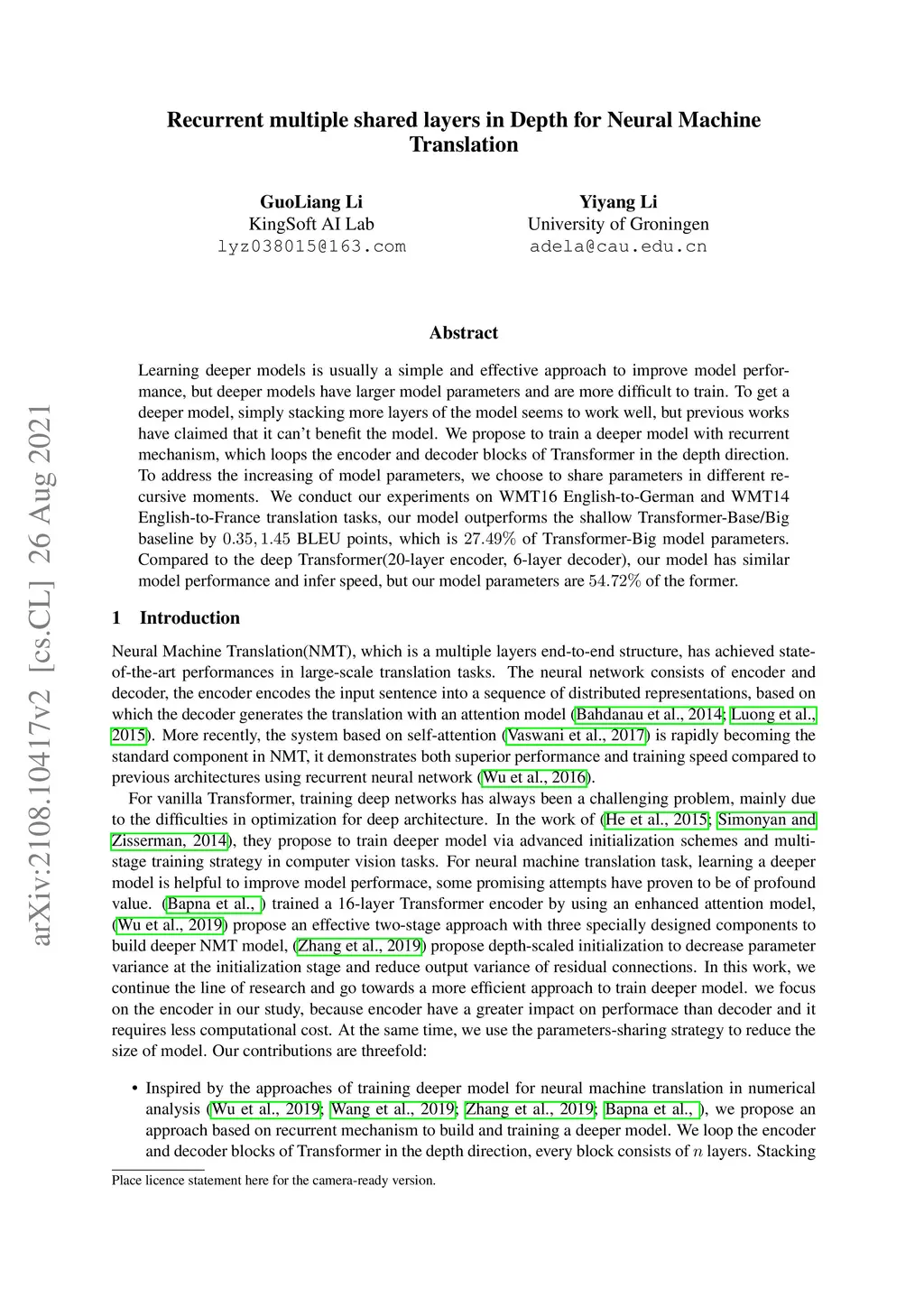 Recurrent multiple shared layers in Depth for Neural Machine Translation