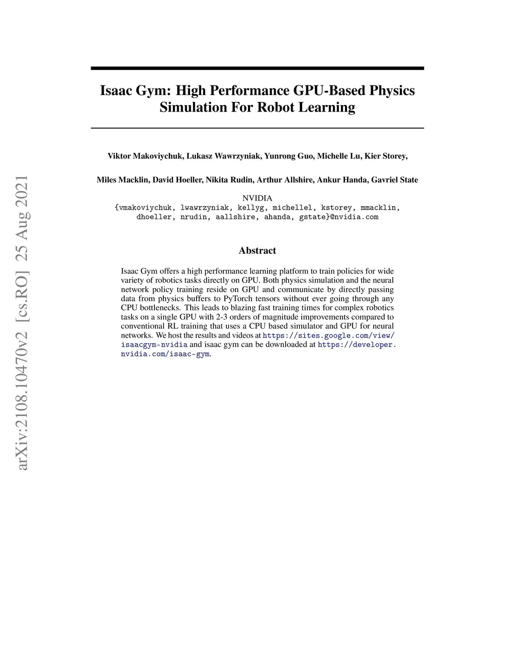 Isaac Gym: High Performance GPU-Based Physics Simulation For Robot