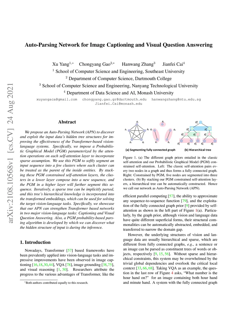 We propose an Auto-Parsing Network (APN) to discover and exploit the input data's hidden tree structures for improving the effectiveness of the Transformer-based vision-language systems. Specifically, we impose a Probabilistic Graphical Model (PGM) parameterized by the attention operations on each self-attention layer to incorporate sparse assumption. We use this PGM to softly segment an input sequence into a few clusters where each cluster can be treated as the parent of the inside entities. By stacking these PGM constrained self-attention layers, the clusters in a lower layer compose into a new sequence, and the PGM in a higher layer will further segment this sequence. Iteratively, a sparse tree can be implicitly parsed, and this tree's hierarchical knowledge is incorporated into the transformed embeddings, which can be used for solving the target vision-language tasks. Specifically, we showcase that our APN can strengthen Transformer based networks in two major vision-language tasks: Captioning and Visual Question Answering. Also, a PGM probability-based parsing algorithm is developed by which we can discover what the hidden structure of input is during the inference.