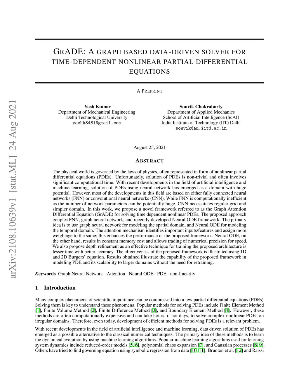 The physical world is governed by the laws of physics, often represented in form of nonlinear partial differential equations (PDEs). Unfortunately, solution of PDEs is non-trivial and often involves significant computational time. With recent developments in the field of artificial intelligence and machine learning, the solution of PDEs using neural network has emerged as a domain with huge potential. However, most of the developments in this field are based on either fully connected neural networks (FNN) or convolutional neural networks (CNN). While FNN is computationally inefficient as the number of network parameters can be potentially huge, CNN necessitates regular grid and simpler domain. In this work, we propose a novel framework referred to as the Graph Attention Differential Equation (GrADE) for solving time dependent nonlinear PDEs. The proposed approach couples FNN, graph neural network, and recently developed Neural ODE framework. The primary idea is to use graph neural network for modeling the spatial domain, and Neural ODE for modeling the temporal domain. The attention mechanism identifies important inputs/features and assign more weightage to the same; this enhances the performance of the proposed framework. Neural ODE, on the other hand, results in constant memory cost and allows trading of numerical precision for speed. We also propose depth refinement as an effective technique for training the proposed architecture in lesser time with better accuracy. The effectiveness of the proposed framework is illustrated using 1D and 2D Burgers' equations. Results obtained illustrate the capability of the proposed framework in modeling PDE and its scalability to larger domains without the need for retraining.