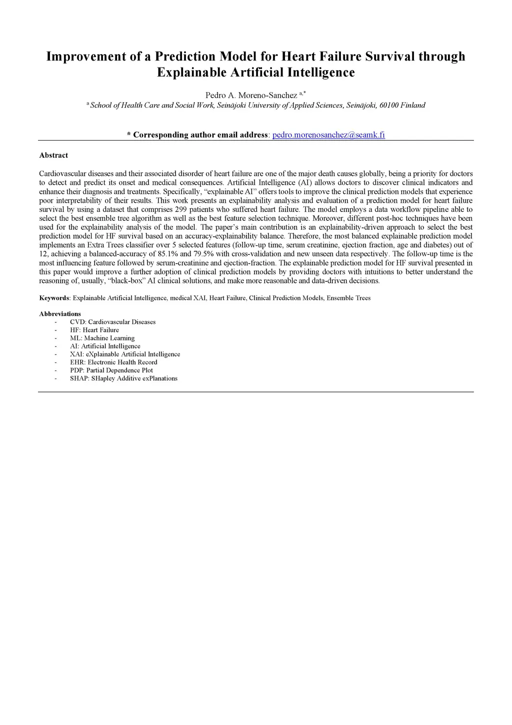 Cardiovascular diseases and their associated disorder of heart failure are one of the major death causes globally, being a priority for doctors to detect and predict its onset and medical consequences. Artificial Intelligence (AI) allows doctors to discover clinical indicators and enhance their diagnosis and treatments. Specifically, explainable AI offers tools to improve the clinical prediction models that experience poor interpretability of their results. This work presents an explainability analysis and evaluation of a prediction model for heart failure survival by using a dataset that comprises 299 patients who suffered heart failure. The model employs a data workflow pipeline able to select the best ensemble tree algorithm as well as the best feature selection technique. Moreover, different post-hoc techniques have been used for the explainability analysis of the model. The paper's main contribution is an explainability-driven approach to select the best prediction model for HF survival based on an accuracy-explainability balance. Therefore, the most balanced explainable prediction model implements an Extra Trees classifier over 5 selected features (follow-up time, serum creatinine, ejection fraction, age and diabetes) out of 12, achieving a balanced-accuracy of 85.1% and 79.5% with cross-validation and new unseen data respectively. The follow-up time is the most influencing feature followed by serum-creatinine and ejection-fraction. The explainable prediction model for HF survival presented in this paper would improve a further adoption of clinical prediction models by providing doctors with intuitions to better understand the reasoning of, usually, black-box AI clinical solutions, and make more reasonable and data-driven decisions.