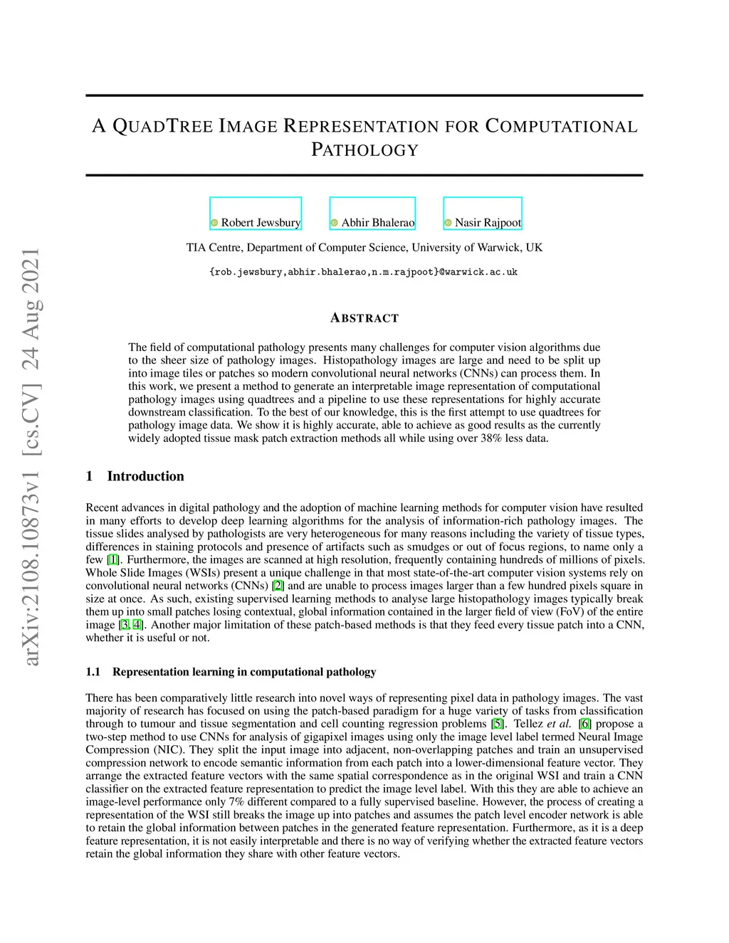 The field of computational pathology presents many challenges for computer vision algorithms due to the sheer size of pathology images. Histopathology images are large and need to be split up into image tiles or patches so modern convolutional neural networks (CNNs) can process them. In this work, we present a method to generate an interpretable image representation of computational pathology images using quadtrees and a pipeline to use these representations for highly accurate downstream classification. To the best of our knowledge, this is the first attempt to use quadtrees for pathology image data. We show it is highly accurate, able to achieve as good results as the currently widely adopted tissue mask patch extraction methods all while using over 38% less data.