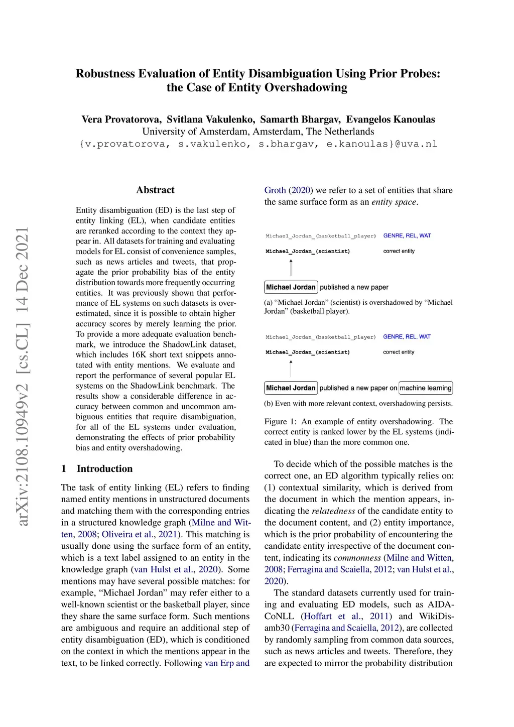 Entity disambiguation (ED) is the last step of entity linking (EL), when candidate entities are reranked according to the context they appear in. All datasets for training and evaluating models for EL consist of convenience samples, such as news articles and tweets, that propagate the prior probability bias of the entity distribution towards more frequently occurring entities. It was previously shown that the performance of the EL systems on such datasets is overestimated since it is possible to obtain higher accuracy scores by merely learning the prior. To provide a more adequate evaluation benchmark, we introduce the ShadowLink dataset, which includes 16K short text snippets annotated with entity mentions. We evaluate and report the performance of popular EL systems on the ShadowLink benchmark. The results show a considerable difference in accuracy between more and less common entities for all of the EL systems under evaluation, demonstrating the effects of prior probability bias and entity overshadowing.