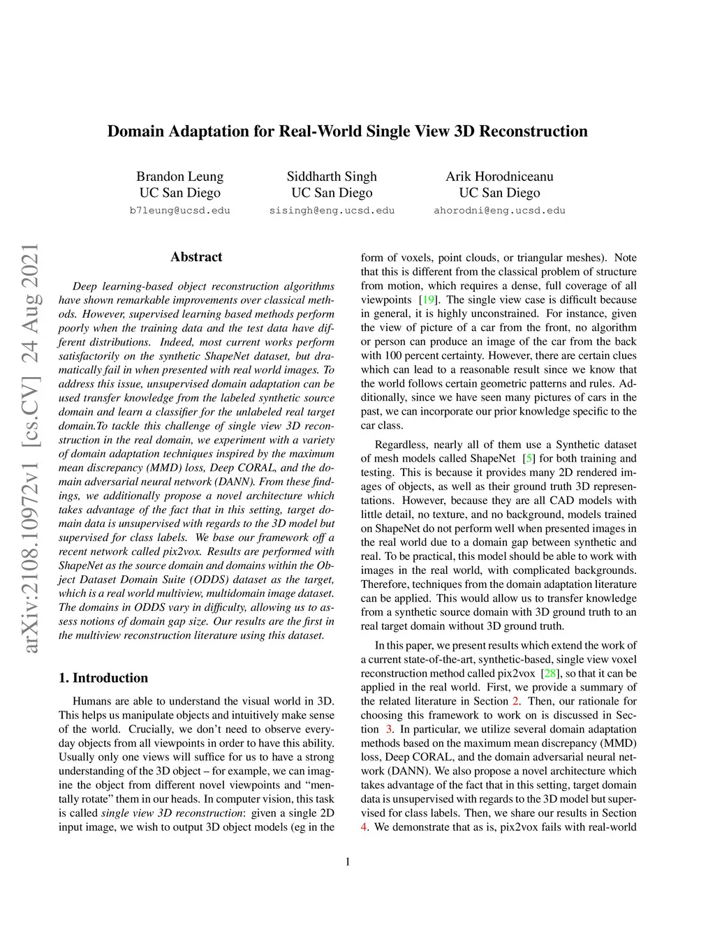 Deep learning-based object reconstruction algorithms have shown remarkable improvements over classical methods. However, supervised learning based methods perform poorly when the training data and the test data have different distributions. Indeed, most current works perform satisfactorily on the synthetic ShapeNet dataset, but dramatically fail in when presented with real world images. To address this issue, unsupervised domain adaptation can be used transfer knowledge from the labeled synthetic source domain and learn a classifier for the unlabeled real target domain. To tackle this challenge of single view 3D reconstruction in the real domain, we experiment with a variety of domain adaptation techniques inspired by the maximum mean discrepancy (MMD) loss, Deep CORAL, and the domain adversarial neural network (DANN). From these findings, we additionally propose a novel architecture which takes advantage of the fact that in this setting, target domain data is unsupervised with regards to the 3D model but supervised for class labels. We base our framework off a recent network called pix2vox. Results are performed with ShapeNet as the source domain and domains within the Object Dataset Domain Suite (ODDS) dataset as the target, which is a real world multiview, multidomain image dataset. The domains in ODDS vary in difficulty, allowing us to assess notions of domain gap size. Our results are the first in the multiview reconstruction literature using this dataset.
