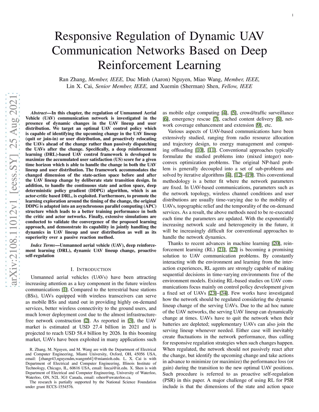 In this chapter, the regulation of Unmanned Aerial Vehicle (UAV) communication network is investigated in the presence of dynamic changes in the UAV lineup and user distribution. We target an optimal UAV control policy which is capable of identifying the upcoming change in the UAV lineup (quit or join-in) or user distribution, and proactively relocating the UAVs ahead of the change rather than passively dispatching the UAVs after the change. Specifically, a deep reinforcement learning (DRL)-based UAV control framework is developed to maximize the accumulated user satisfaction (US) score for a given time horizon which is able to handle the change in both the UAV lineup and user distribution. The framework accommodates the changed dimension of the state-action space before and after the UAV lineup change by deliberate state transition design. In addition, to handle the continuous state and action space, deep deterministic policy gradient (DDPG) algorithm, which is an actor-critic based DRL, is exploited. Furthermore, to promote the learning exploration around the timing of the change, the original DDPG is adapted into an asynchronous parallel computing (APC) structure which leads to a better training performance in both the critic and actor networks. Finally, extensive simulations are conducted to validate the convergence of the proposed learning approach, and demonstrate its capability in jointly handling the dynamics in UAV lineup and user distribution as well as its superiority over a passive reaction method.