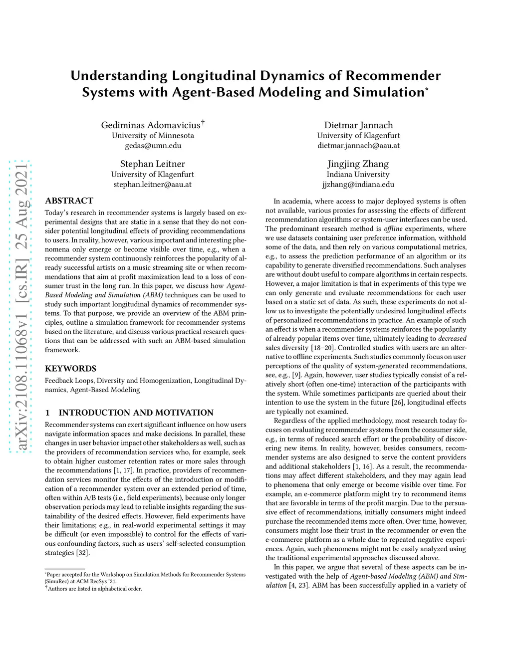 Today's research in recommender systems is largely based on experimental designs that are static in a sense that they do not consider potential longitudinal effects of providing recommendations to users. In reality, however, various important and interesting phenomena only emerge or become visible over time, e.g., when a recommender system continuously reinforces the popularity of already successful artists on a music streaming site or when recommendations that aim at profit maximization lead to a loss of consumer trust in the long run. In this paper, we discuss how Agent-Based Modeling and Simulation (ABM) techniques can be used to study such important longitudinal dynamics of recommender systems. To that purpose, we provide an overview of the ABM principles, outline a simulation framework for recommender systems based on the literature, and discuss various practical research questions that can be addressed with such an ABM-based simulation framework.