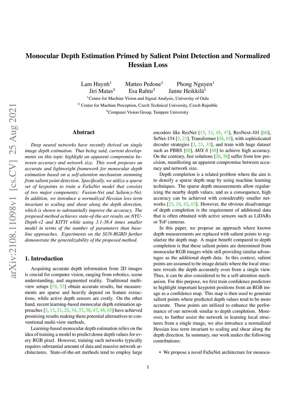 Deep neural networks have recently thrived on single image depth estimation. That being said, current developments on this topic highlight an apparent compromise between accuracy and network size. This work proposes an accurate and lightweight framework for monocular depth estimation based on a self-attention mechanism stemming from salient point detection. Specifically, we utilize a sparse set of keypoints to train a FuSaNet model that consists of two major components: Fusion-Net and Saliency-Net. In addition, we introduce a normalized Hessian loss term invariant to scaling and shear along the depth direction, which is shown to substantially improve the accuracy. The proposed method achieves state-of-the-art results on NYU-Depth-v2 and KITTI while using 3.1-38.4 times smaller model in terms of the number of parameters than baseline approaches. Experiments on the SUN-RGBD further demonstrate the generalizability of the proposed method.