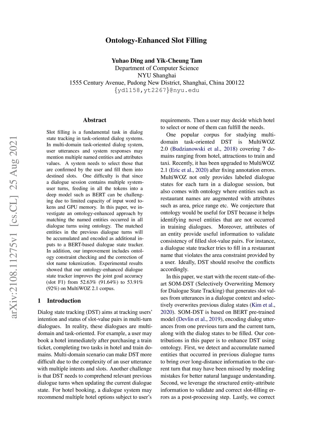 Slot filling is a fundamental task in dialog state tracking in task-oriented dialog systems. In multi-domain task-oriented dialog system, user utterances and system responses may mention multiple named entities and attributes values. A system needs to select those that are confirmed by the user and fill them into destined slots. One difficulty is that since a dialogue session contains multiple system-user turns, feeding in all the tokens into a deep model such as BERT can be challenging due to limited capacity of input word tokens and GPU memory. In this paper, we investigate an ontology-enhanced approach by matching the named entities occurred in all dialogue turns using ontology. The matched entities in the previous dialogue turns will be accumulated and encoded as additional inputs to a BERT-based dialogue state tracker. In addition, our improvement includes ontology constraint checking and the correction of slot name tokenization. Experimental results showed that our ontology-enhanced dialogue state tracker improves the joint goal accuracy (slot F1) from 52.63% (91.64%) to 53.91% (92%) on MultiWOZ 2.1 corpus.
