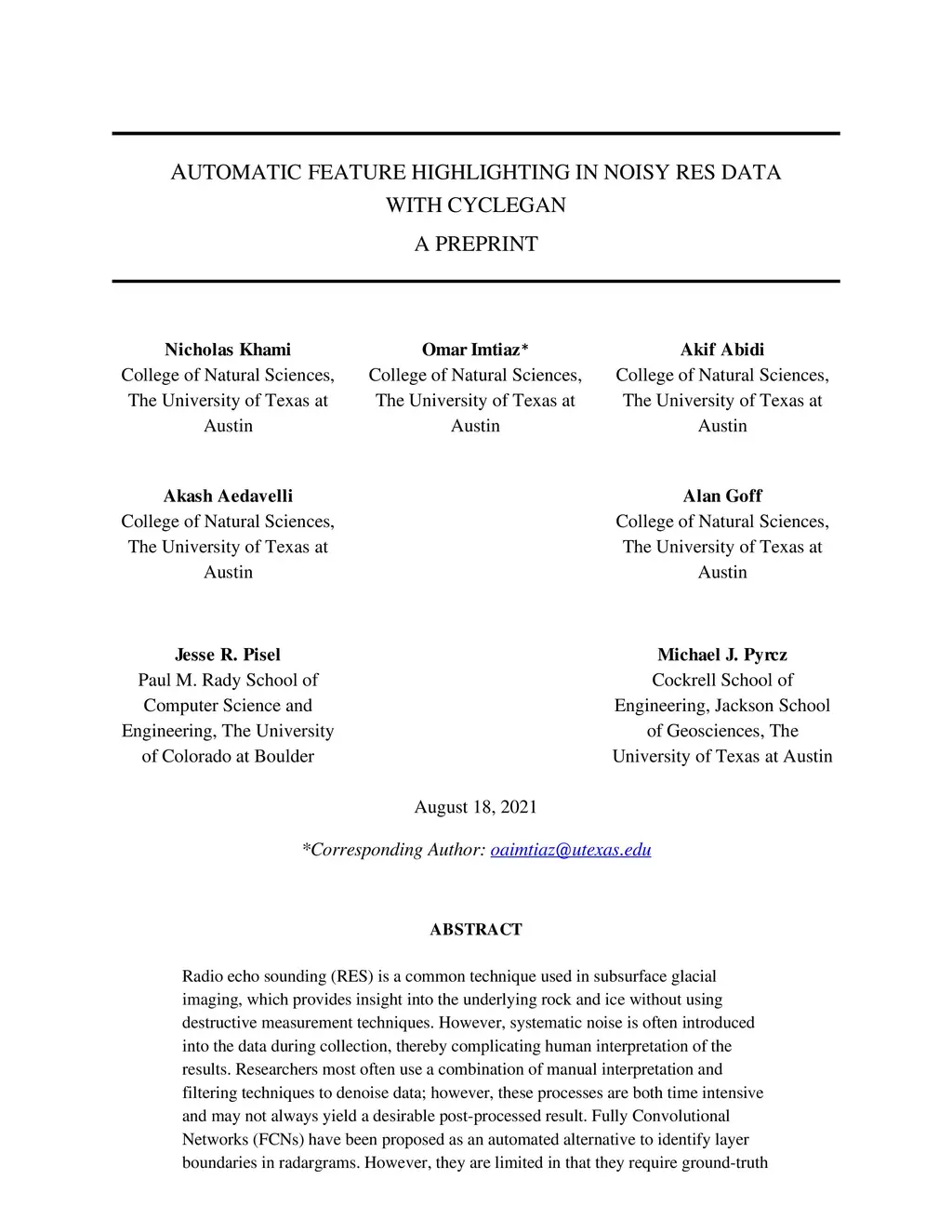 Radio echo sounding (RES) is a common technique used in subsurface glacial imaging, which provides insight into the underlying rock and ice. However, systematic noise is introduced into the data during collection, complicating interpretation of the results. Researchers most often use a combination of manual interpretation and filtering techniques to denoise data; however, these processes are time intensive and inconsistent. Fully Convolutional Networks have been proposed as an automated alternative to identify layer boundaries in radargrams. However, they require high-quality manually processed training data and struggle to interpolate data in noisy samples (Varshney et al. 2020). Herein, the authors propose a GAN based model to interpolate layer boundaries through noise and highlight layers in two-dimensional glacial RES data. In real-world noisy images, filtering often results in loss of data such that interpolating layer boundaries is nearly impossible. Furthermore, traditional machine learning approaches are not suited to this task because of the lack of paired data, so we employ an unpaired image-to-image translation model. For this model, we create a synthetic dataset to represent the domain of images with clear, highlighted layers and use an existing real-world RES dataset as our noisy domain. We implement a CycleGAN trained on these two domains to highlight layers in noisy images that can interpolate effectively without significant loss of structure or fidelity. Though the current implementation is not a perfect solution, the model clearly highlights layers in noisy data and allows researchers to determine layer size and position without mathematical filtering, manual processing, or ground-truth images for training. This is significant because clean images generated by our model enable subsurface researchers to determine glacial layer thickness more efficiently.