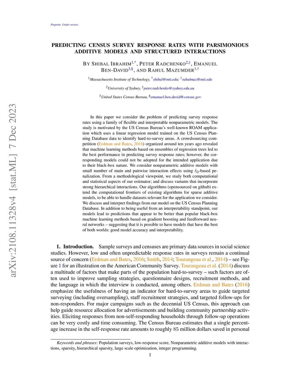 In this paper, we consider the problem of predicting survey response rates using a family of flexible and interpretable nonparametric models. The study is motivated by the US Census Bureau's well-known ROAM application, which uses a linear regression model trained on the US Census Planning Database data to identify hard-to-survey areas. A crowdsourcing competition (Erdman and Bates, 2016) organized more than ten years ago revealed that machine learning methods based on ensembles of regression trees led to the best performance in predicting survey response rates; however, the corresponding models could not be adopted for the intended application due to their black-box nature. We consider nonparametric additive models with a small number of main and pairwise interaction effects using -based penalization. From a methodological viewpoint, we study our estimator's computational and statistical aspects and discuss variants incorporating strong hierarchical interactions. Our algorithms (open-sourced on GitHub) extend the computational frontiers of existing algorithms for sparse additive models to be able to handle datasets relevant to the application we consider. We discuss and interpret findings from our model on the US Census Planning Database. In addition to being useful from an interpretability standpoint, our models lead to predictions comparable to popular black-box machine learning methods based on gradient boosting and feedforward neural networks - suggesting that it is possible to have models that have the best of both worlds: good model accuracy and interpretability.