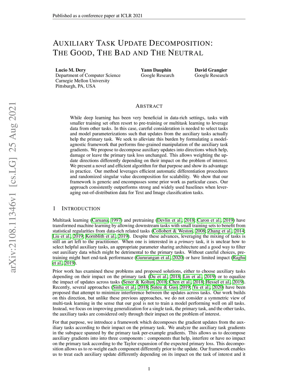 While deep learning has been very beneficial in data-rich settings, tasks with smaller training set often resort to pre-training or multitask learning to leverage data from other tasks. In this case, careful consideration is needed to select tasks and model parameterizations such that updates from the auxiliary tasks actually help the primary task. We seek to alleviate this burden by formulating a model-agnostic framework that performs fine-grained manipulation of the auxiliary task gradients. We propose to decompose auxiliary updates into directions which help, damage or leave the primary task loss unchanged. This allows weighting the update directions differently depending on their impact on the problem of interest. We present a novel and efficient algorithm for that purpose and show its advantage in practice. Our method leverages efficient automatic differentiation procedures and randomized singular value decomposition for scalability. We show that our framework is generic and encompasses some prior work as particular cases. Our approach consistently outperforms strong and widely used baselines when leveraging out-of-distribution data for Text and Image classification tasks.